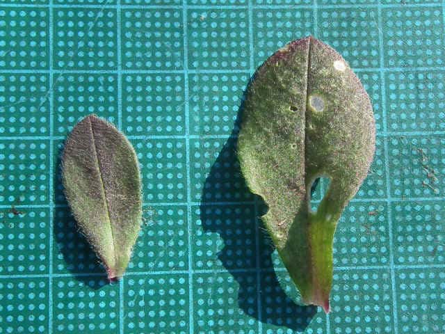 | 左は日当りの悪い場所に生えていた関係なのか、花弁の発達が悪い。右は若干日当りの良い場所のもの。花弁以外に相違点がない。 | ||