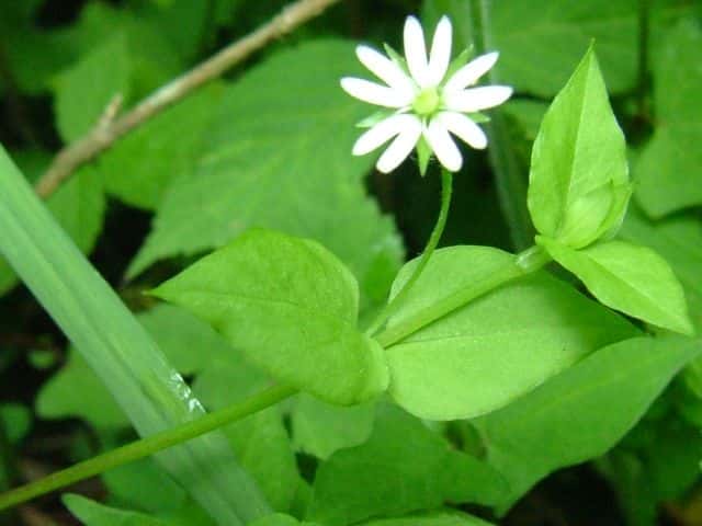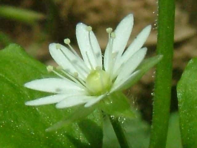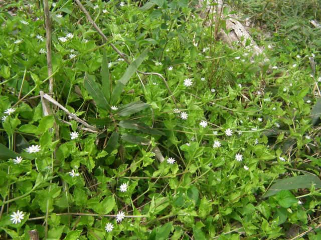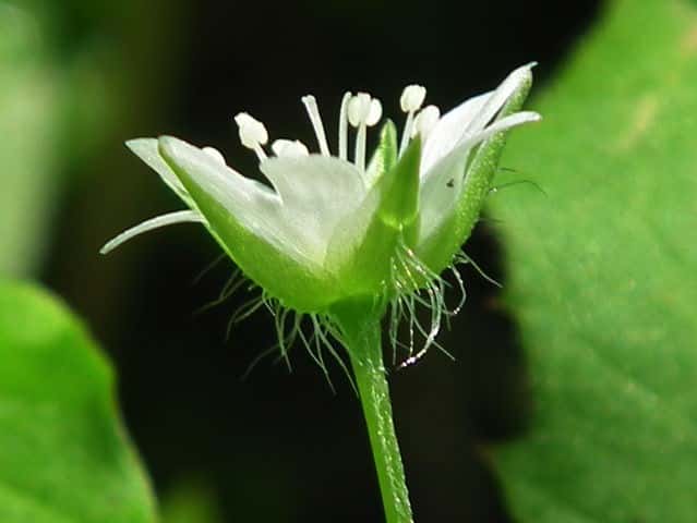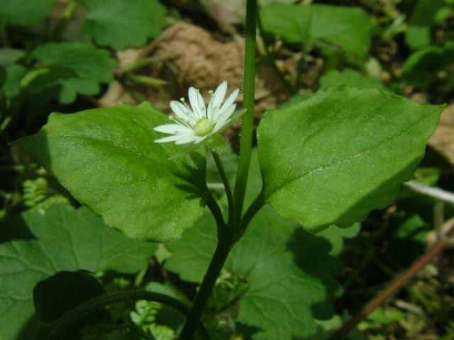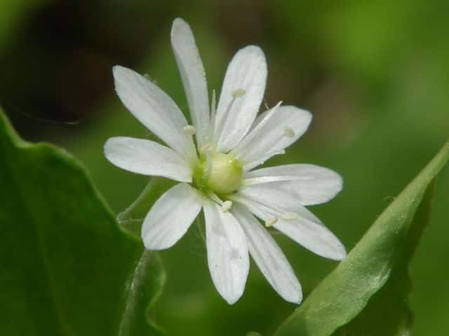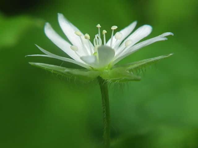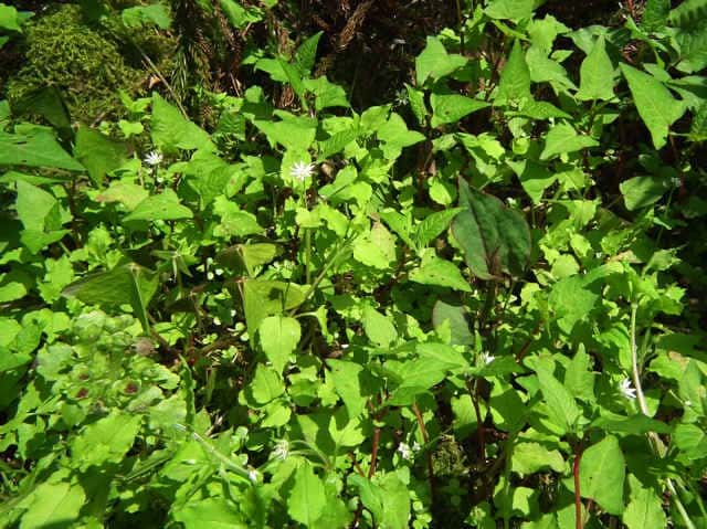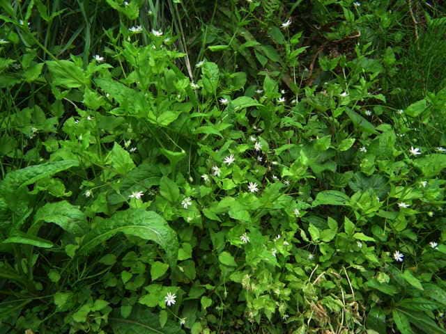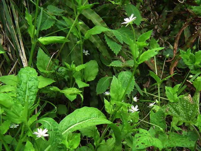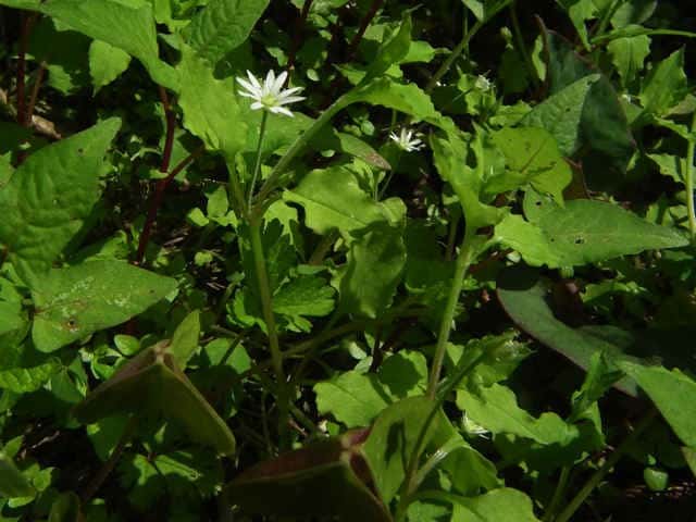 多年草 北海道西南部〜九州の山地谷沿いの湿地生える。茎は地をはい、上部は斜上し20〜40cm。2列の毛がある(南々社「広島の山野草」では1列の毛となっている。)。葉は黄緑色で対生し、広卵形で長さ1〜3.5cm。基部はやや心形。表面は無毛。裏面脈上に微毛がある。上部葉腋から有毛の柄をだし、直径1〜1.5cmの白花を開く。花弁5個は深く切れ込み、10弁に見える。花期は5〜7月。(山に咲く花) 学名は、Stellaria sessiliflora ナデシコ科ハコベ属 |