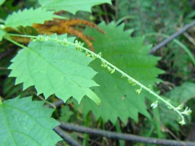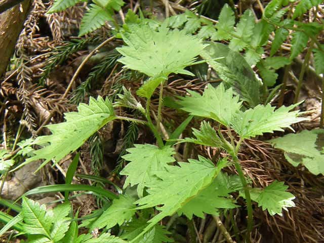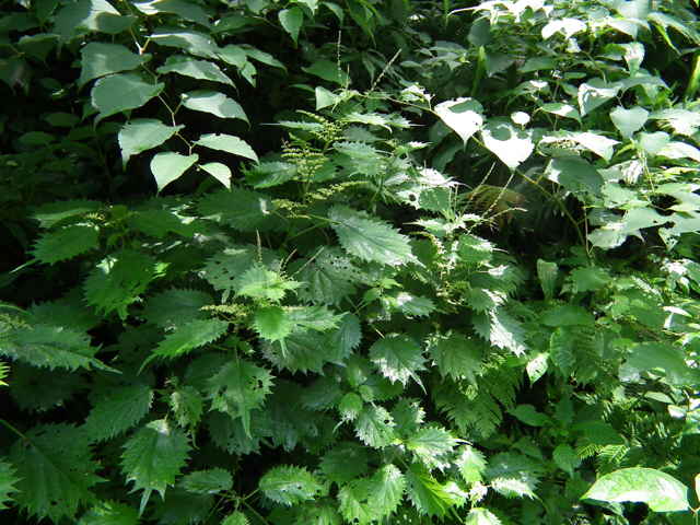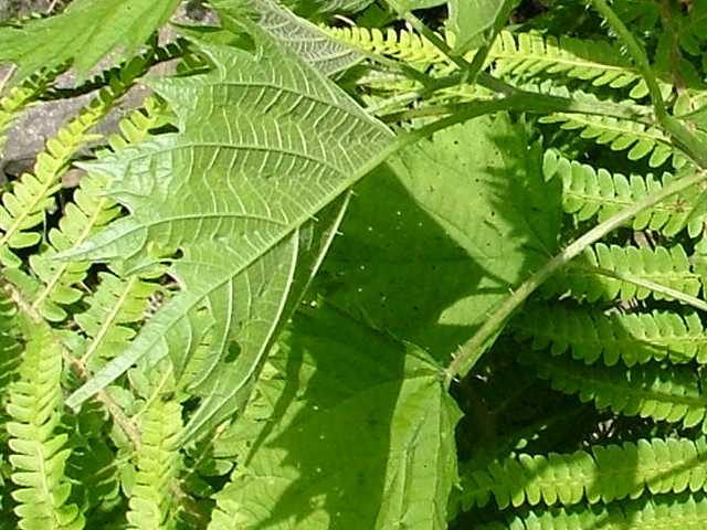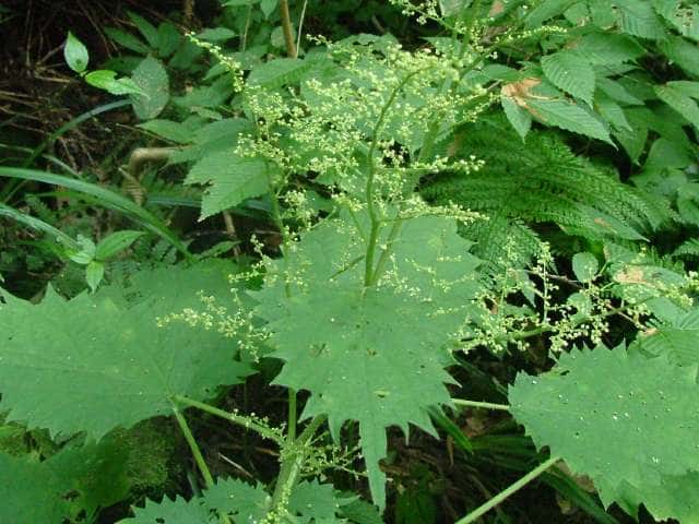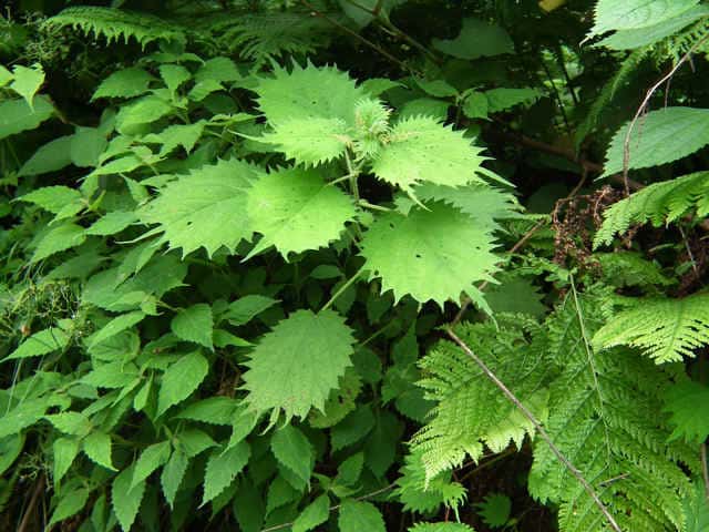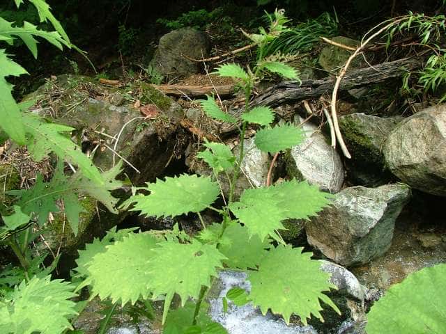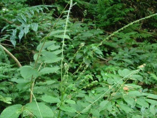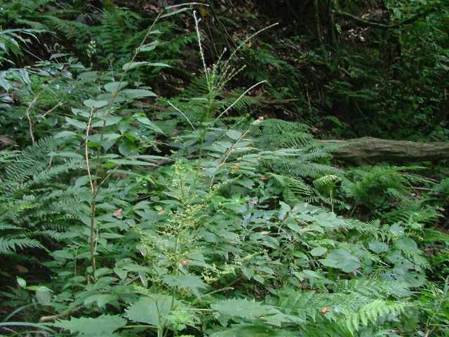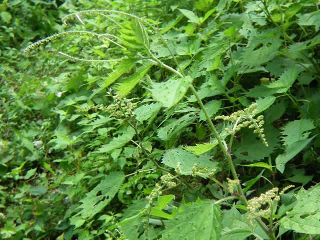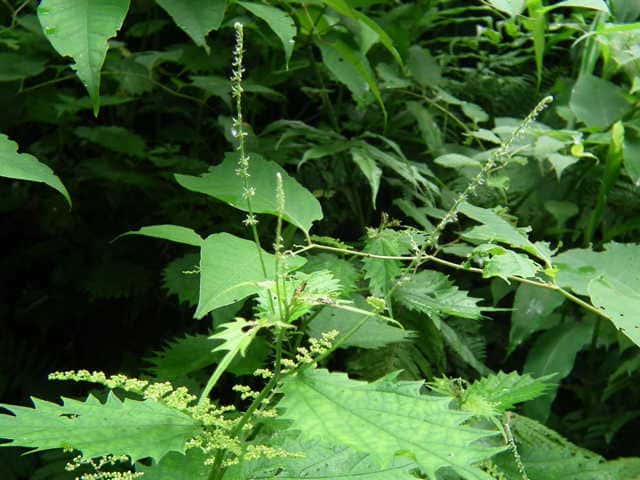 | 多年草 北海道〜九州の山地、亜高山のやや湿った沢沿いなどに生える。茎は高さ40〜80cm。茎や葉に刺があり、刺さると痛い。葉は互生し、柄は長く、葉身は広卵形で長さ6〜15cm、先は尾状に長くのび、ふちに粗い鋸歯がある。雌雄同株。雌花序は上部の長い穂に多数つき、花弁状花被片が4個、花柱は1個。雄花は雌花より下の葉腋に円錐状に多数つき、白色で、萼片、雄しべとも5個。花期は7〜9月。(山に咲く花) 学名は、Laportea cuspidata イラクサ科ムカゴイラクサ属 よく似たムカゴイラクサは葉の先が尾状にのびない。またイラクサ属のイラクサは葉が対生する。 |