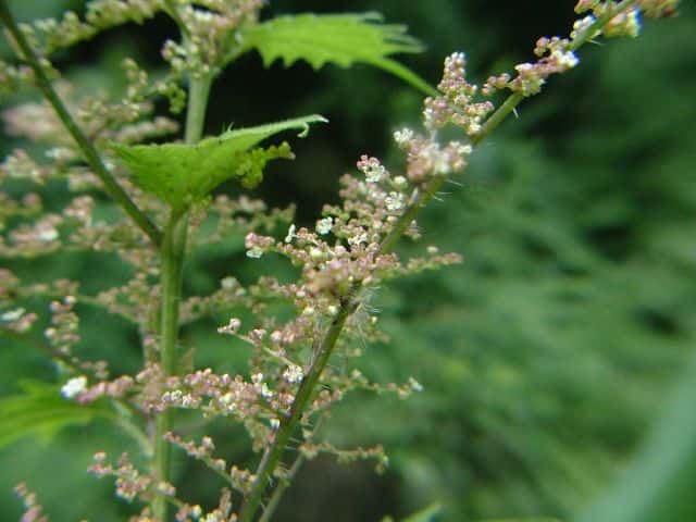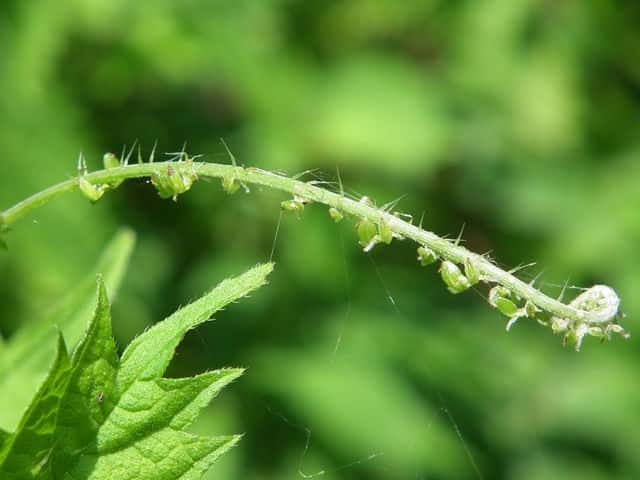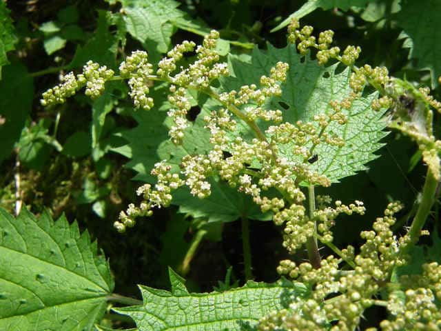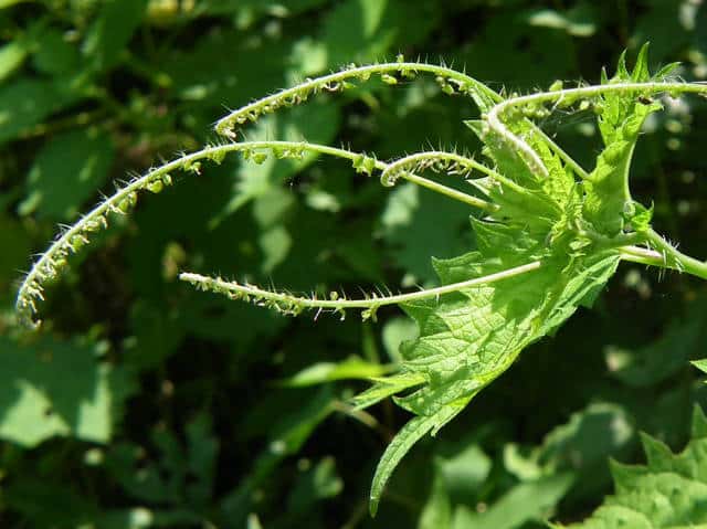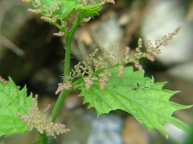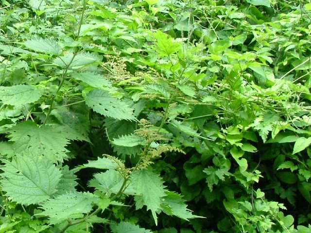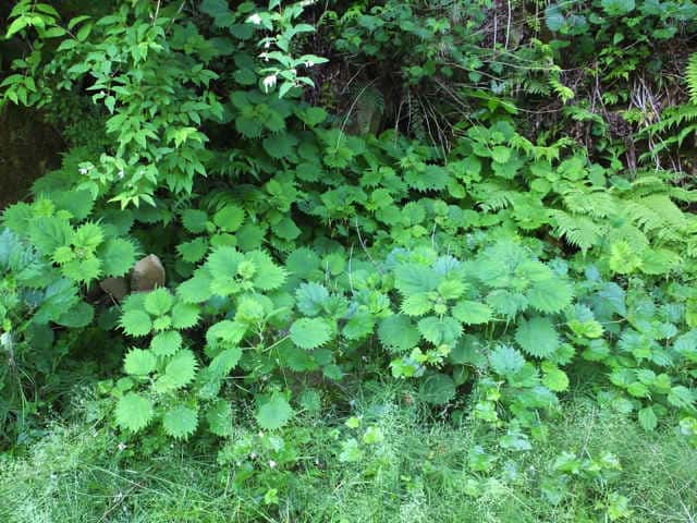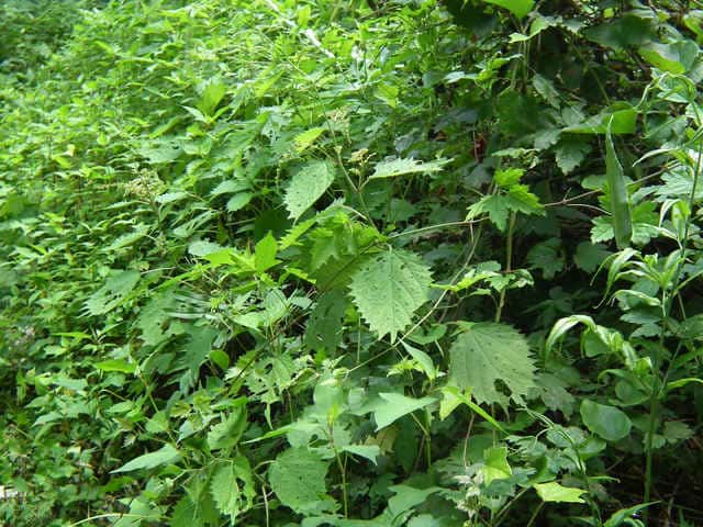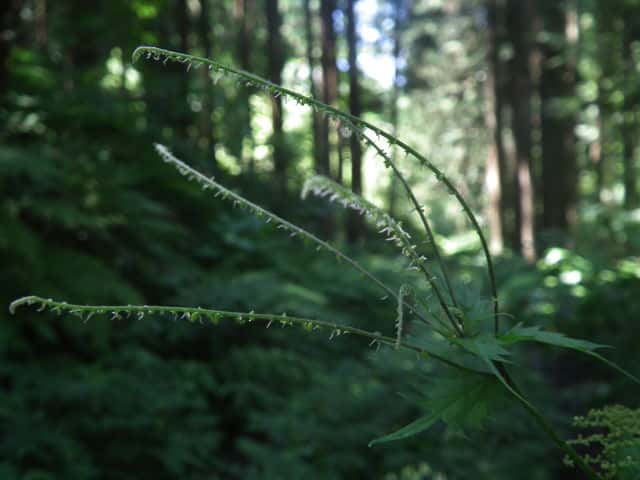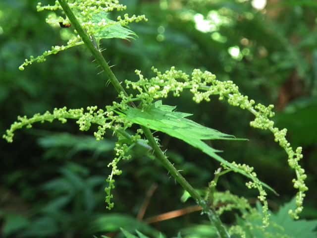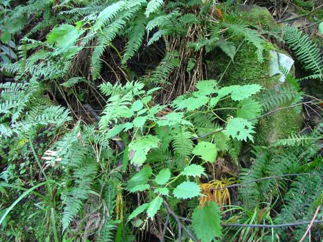 | 多年草 北海道〜九州の山地、亜高山のやや湿った沢沿いなどに生える。茎は高さ40〜80cm。茎や葉に刺があり、刺さると痛い。葉は互生し、柄は長く、葉身は広卵形で長さ6〜15cm、先は尾状に長くのび、ふちに粗い鋸歯がある。雌雄同株。雌花序は上部の長い穂に多数つき、花弁状花被片が4個、花柱は1個。雄花は雌花より下の葉腋に円錐状に多数つき、白色で、萼片、雄しべとも5個。花期は7〜9月。(山に咲く花) 学名は、Laportea cuspidata イラクサ科ムカゴイラクサ属 よく似たムカゴイラクサは葉の先が尾状にのびない。またイラクサ属のイラクサは葉が対生する。 |