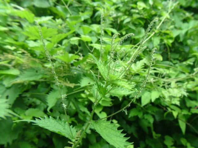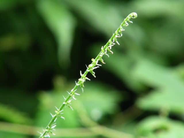 | ▼雌花序は頂部につき穂状に長く伸びる。 | ▼雄花序は下部の葉腋に円錐状に広がる。 | |