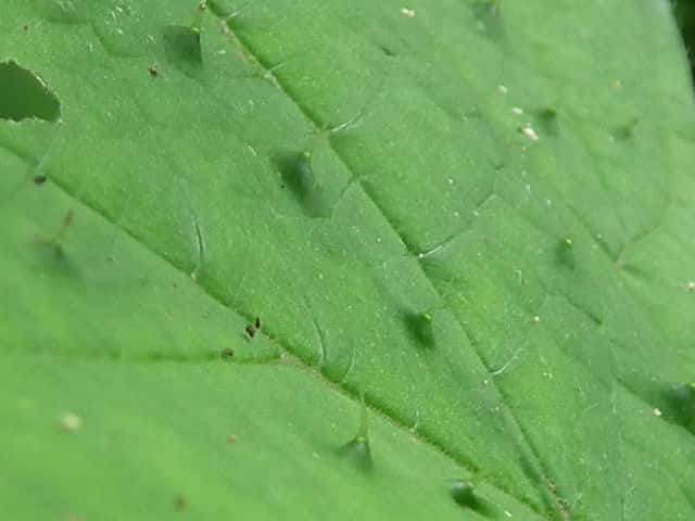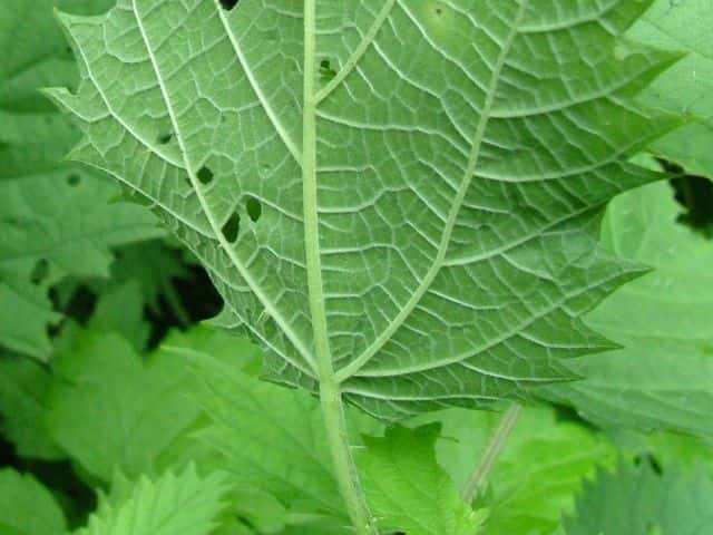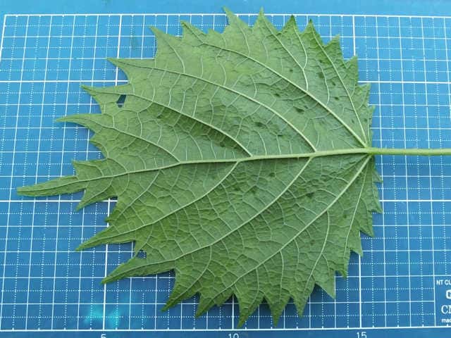 | ▼葉の表面にも毛がある。 | ▼葉身は長さ約15cm。 | ▼葉柄や表面に刺がある。 |