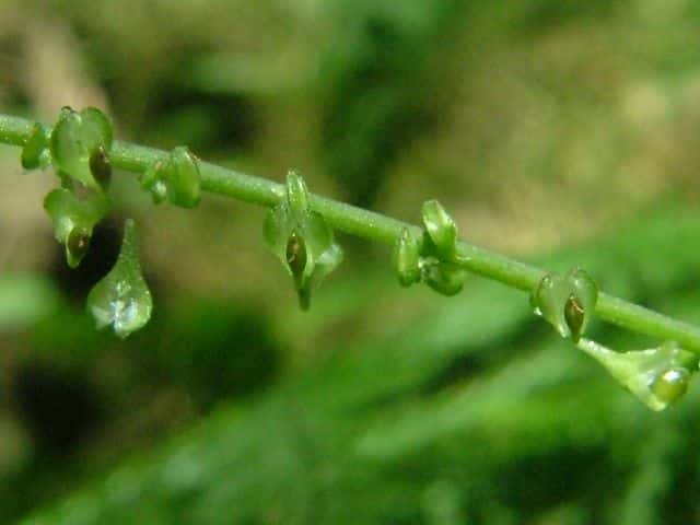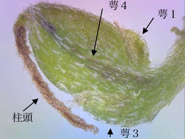 | ▼受粉後の大きくなった子房、長さ約1.5mm。 | ▼子房を4個の萼が包んでいる。萼2と萼4が大きくなって残る。 | |