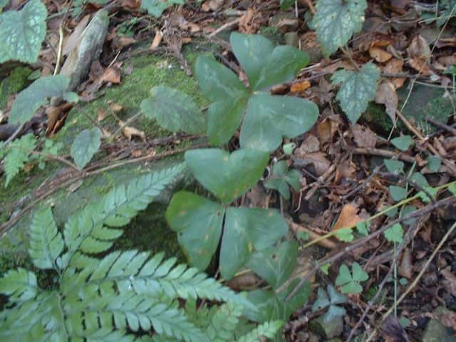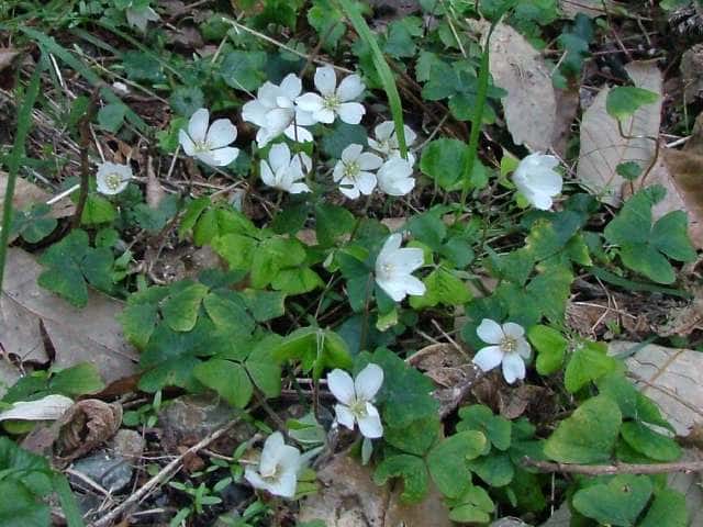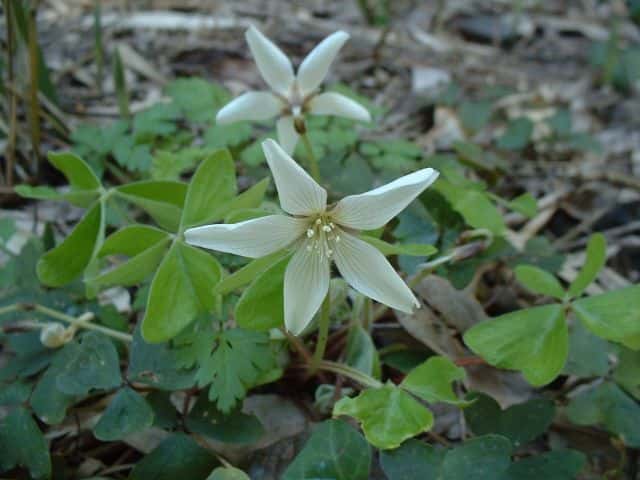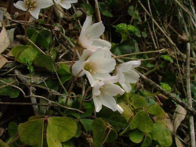多年草 本州〜九州の山地の木陰などに生える。根茎は太く、分枝しない。葉は全て根生して長い柄があり、3小葉からなる。3小葉は基部に関節があり、開く前には内側にたたみ込まれている。小葉は倒心形で長さ1〜2.5cmで、先端は切形で中央が凹み、角は鈍端。葉柄、葉の裏面、花柄に軟毛が密生する。7cmほどの花柄の先に花を1個つける。花は直径3〜4cm、白色で淡い紫色の筋がある。花弁は5個。雄しべは10個、うち5個は短い。柱頭は5裂。果実はさく果、長さ約2cmの楕円形。中に数個の種子があり、白い外皮に包まれ、熟すとはじき出される。花期は3〜4月 学名は、Oxalis griffithii カタバミ科カタバミ属 |