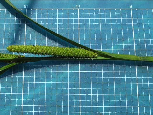 | ▼最下の雌小穂は長さ約8cm、幅約8mm。 | ▼果胞は著しく膨らみ密集する。 | ▼雌鱗片は先の芒だけが見えている。 |