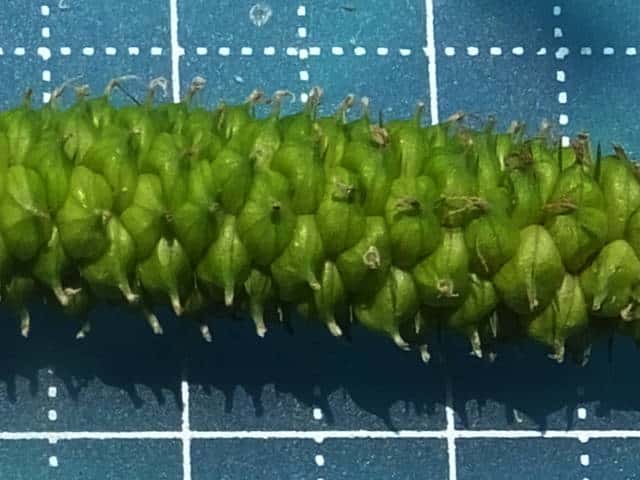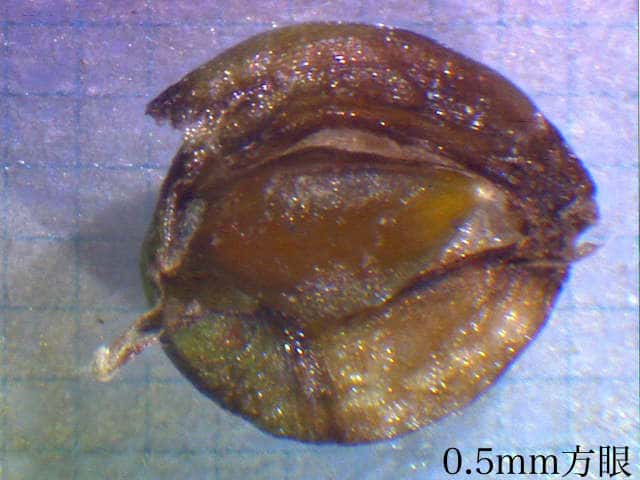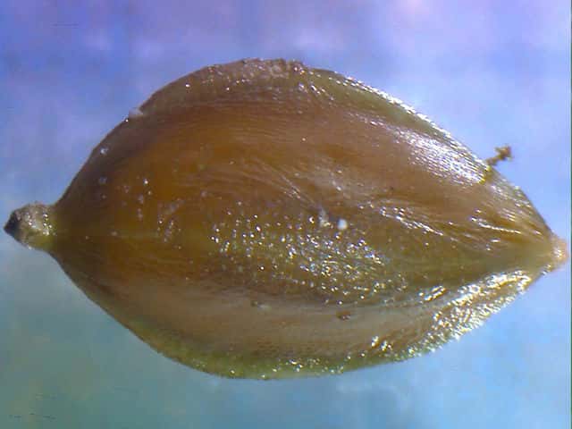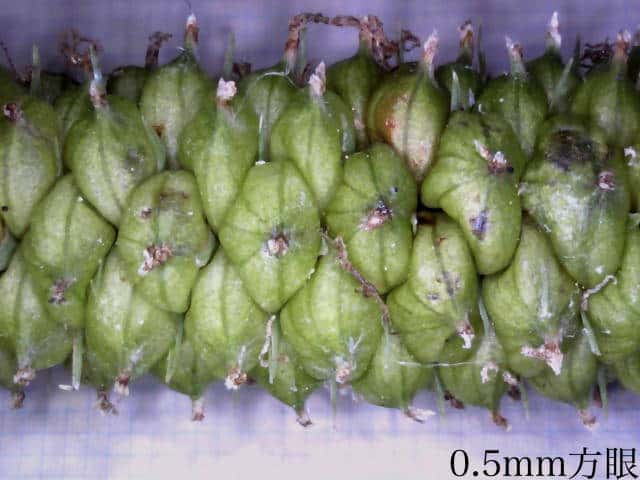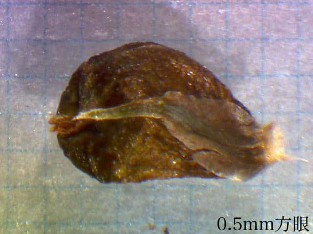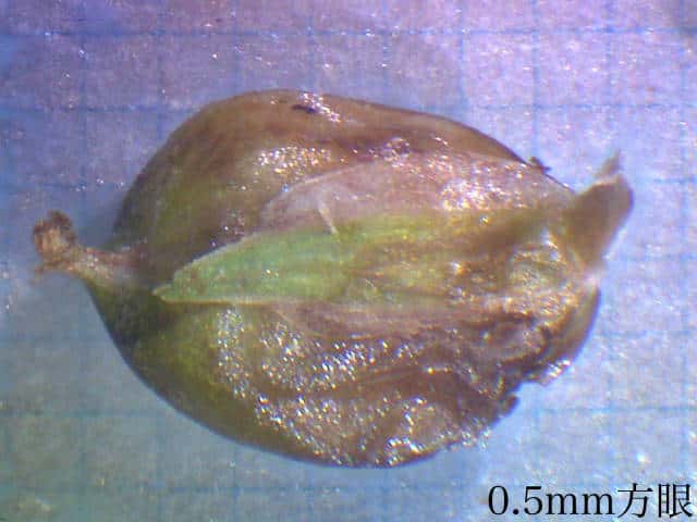 | ▼果胞は長さ約4mm、鱗片は凹頭、芒がある。 | ▼果胞は乾燥すると黒くなる。 | ▼果実は果胞にゆるく包まれている。 |