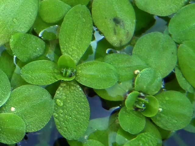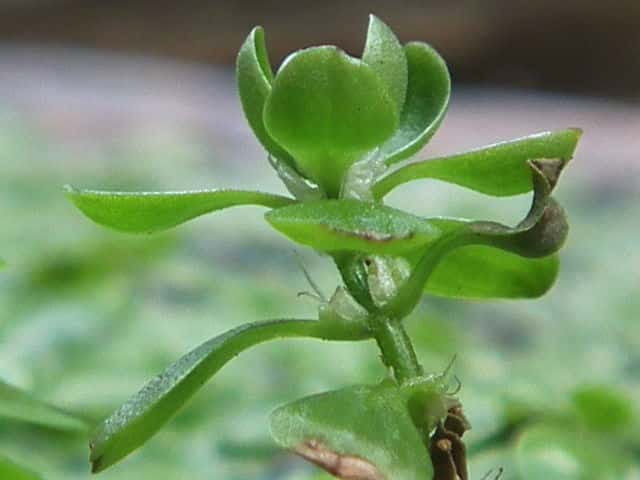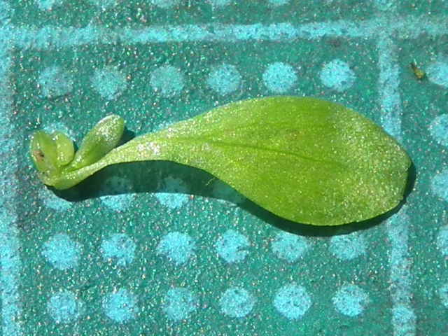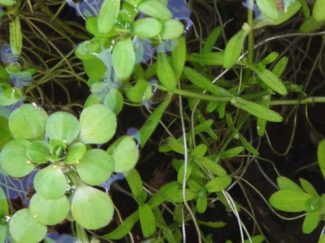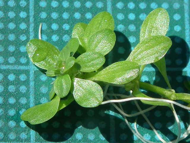 | ▼線形の水中葉をつけた幼い株。 | ▼浮葉はさじ形、長さ8mm。 | |