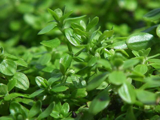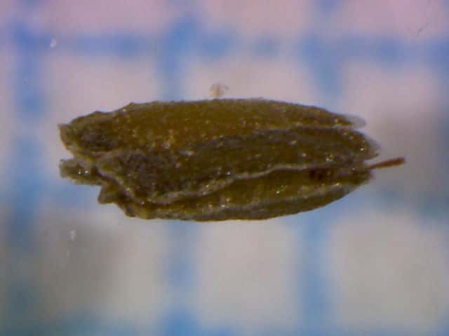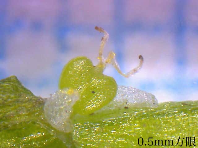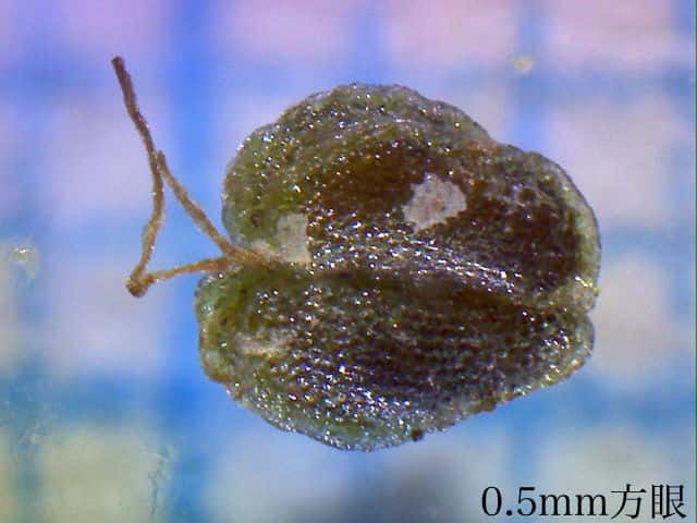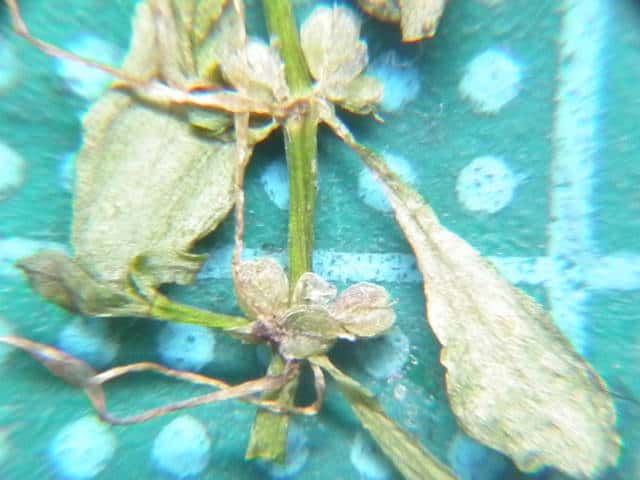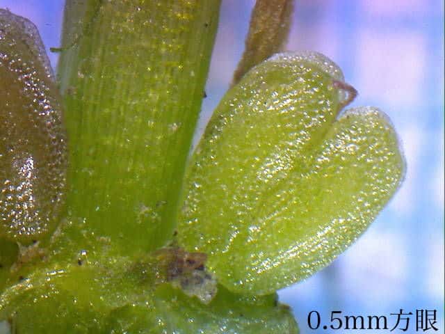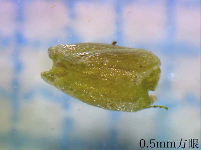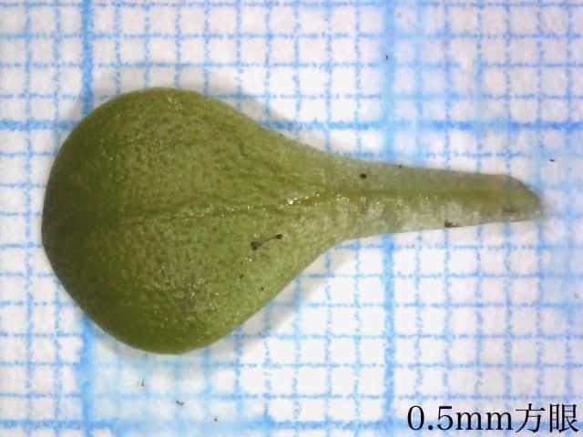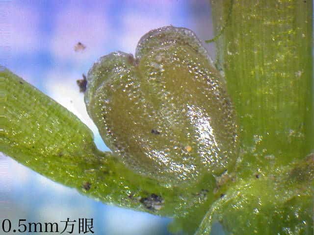 | ▼果実は長さ約1.1mm。 | ▼果実の側面、厚さ約0.5mm。 | ▼水中葉は線形。 |