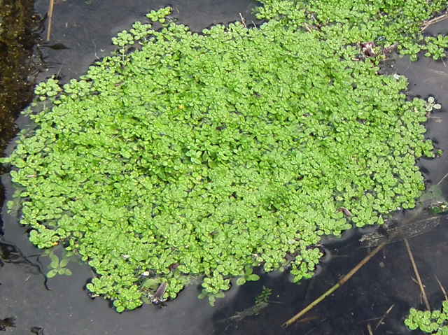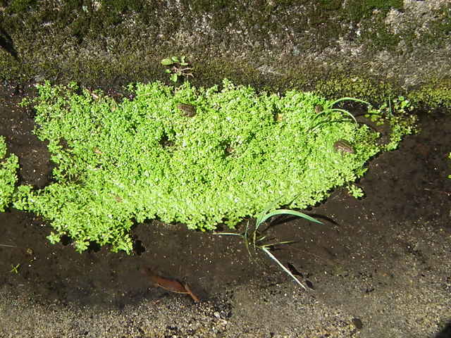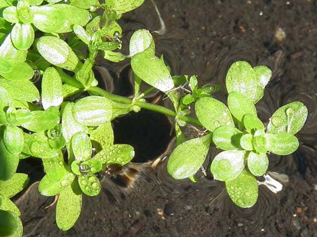 | 1年草または多年草 北海道〜沖縄の湖沼やため池、河川、水路、水田などに生育する沈水〜浮葉〜湿生植物。湧水域と冬も水のある湿田には特に多い。茎は盛んに分枝して伸び、水中で明るい緑白色のパッチをなす。葉は対生で葉柄はない。葉形は顕著な変異を示すが、少なくとも茎の下部の沈水葉は線形で長さ7〜20mm、幅0.5〜1.5mm、1脈で先端は凹形。茎の上部の葉ほど幅が広くなり、浮葉はへら形〜卵状楕円形で長さ6〜15mm、幅3〜6mm、3(〜5)脈。雌雄同株で葉腋に雄花と雌花が各1〜2個並んでつく。雄花は1個の雄しべ、雌花は1個の雌しべからなる。水面上の花は風媒、水中では水媒のほか、花粉管が組織内を雌花に向かって伸びる内性隣花受粉も知られる。果実は4分果からなり偏平、倒卵状楕円形で軍配のような形をしている。本種をミズハコベ、ナンゴクミズハコベ、マンシュウミズハコベの3変種に細分する見解がある。花期は通年。(日本の水草) 学名は、Callitriche palustris オオバコ科アワゴケ属 参考 中国植物誌 よく似たものに帰化植物のイケノミズハコベ(Callitriche stagnalis)がある。やや大型で3〜5本の葉脈があり、水面の葉と水中葉とが同形。果実は長さ幅とも約1.8mmの円形。 |