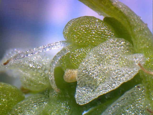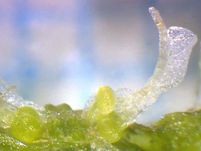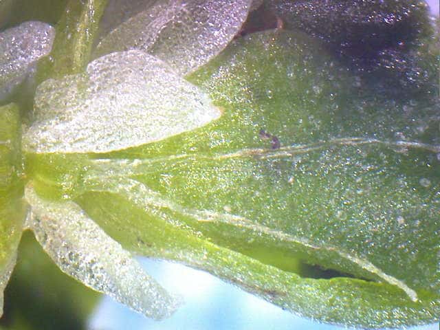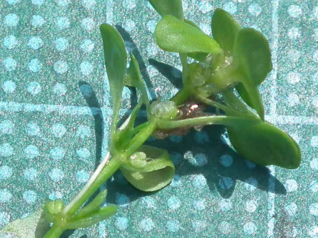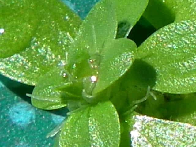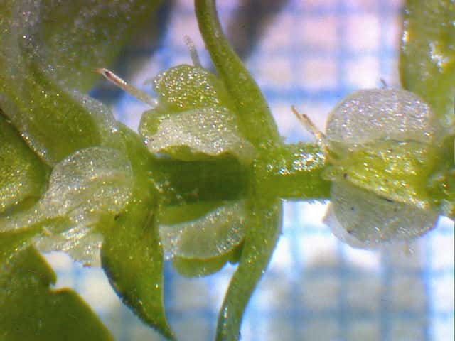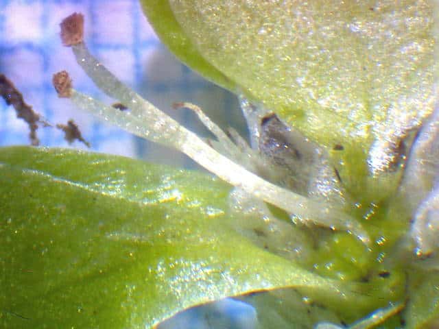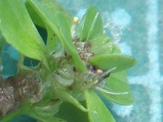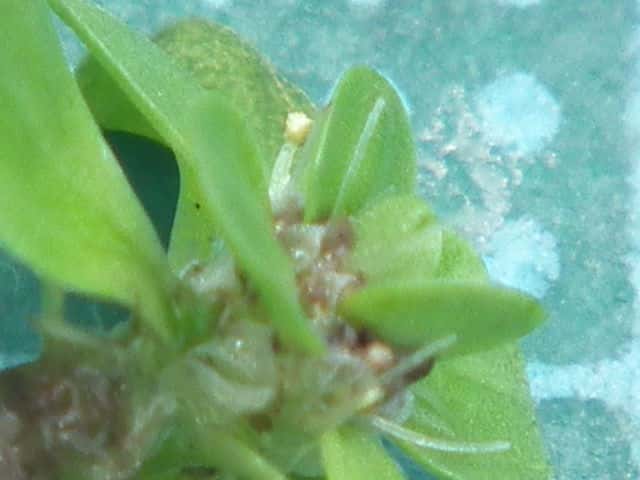 | ▼水中で葉腋につく雌花。子房の長さ約0.5mm。 | ▼茎を除いてある。雌花の脇に雄しべがある。 | ▼長い花柱を伸ばす雌花。 |