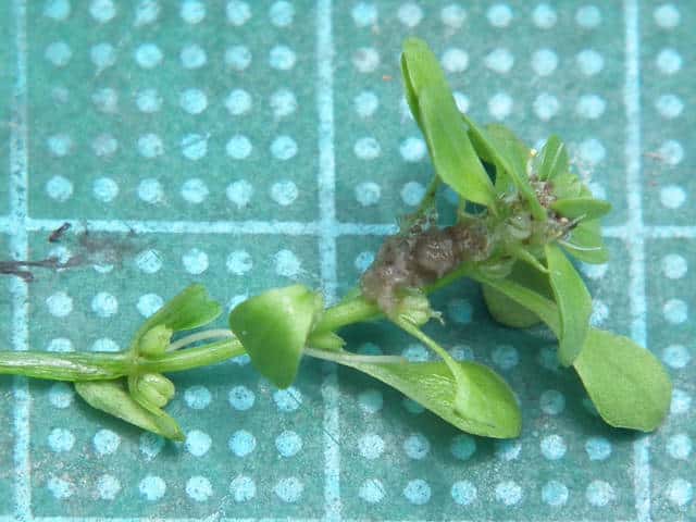 | ▼果実は軍配形。 | ▼葉腋に果実が1個ずつつく。(乾燥標本) | ▼果実は長さ約1mm。 |