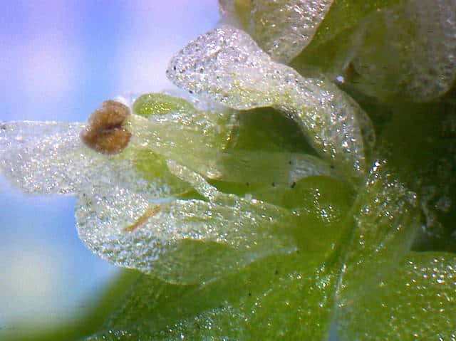 | ▼雌花には花柱が2個ある。 | ▼雌花の脇に雄しべ1本の雄花がある。 | ▼花は2枚の苞に包まれる。 |