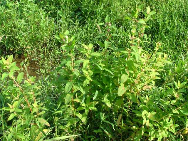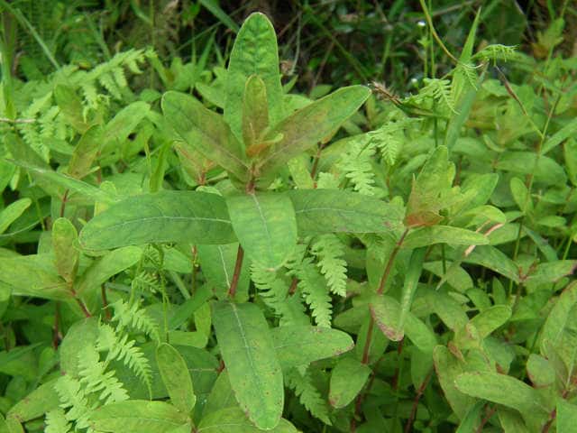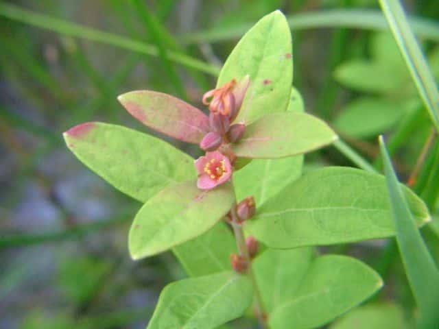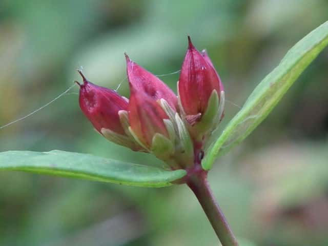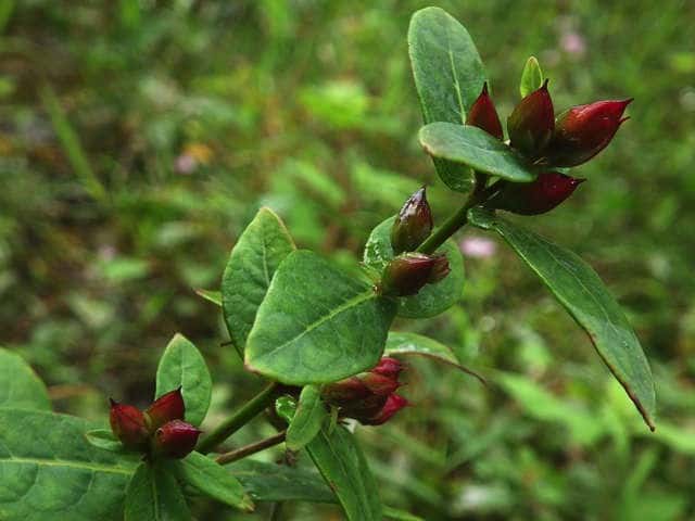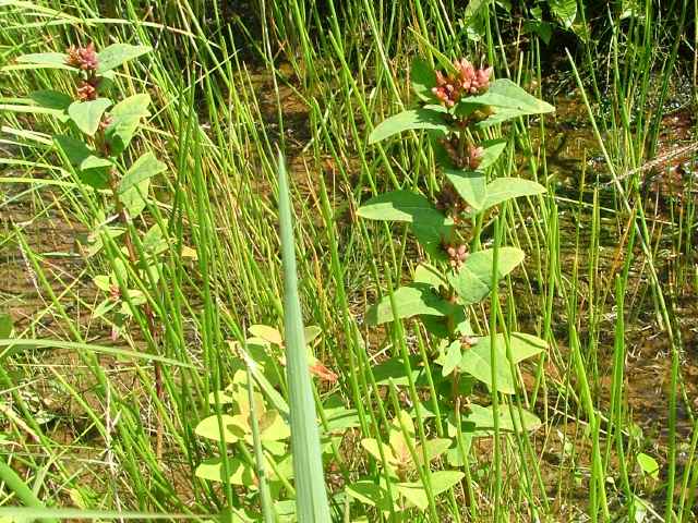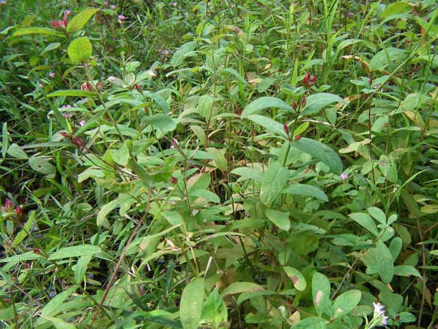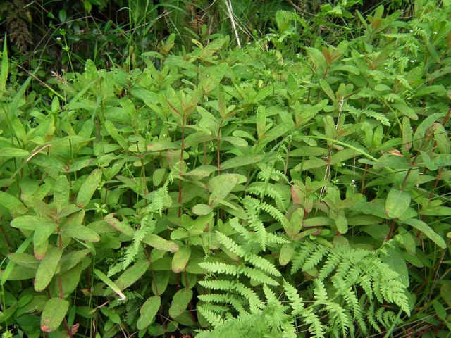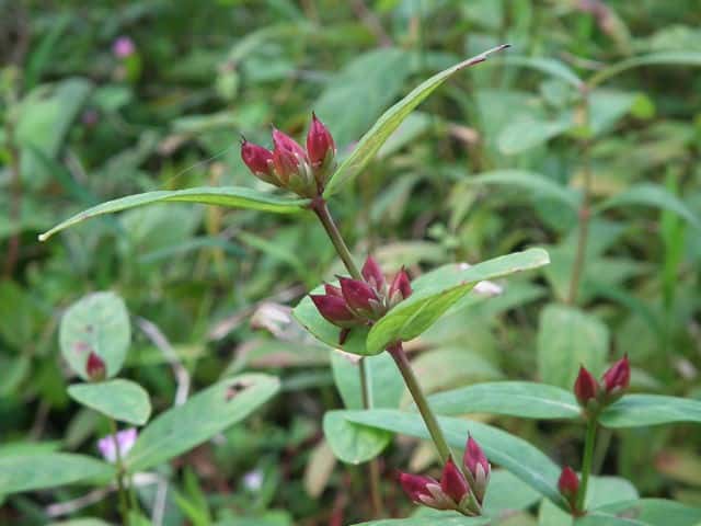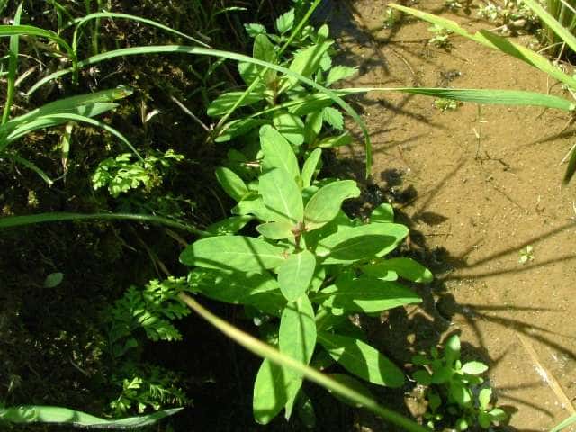 | 多年草 北海道〜九州の池や沼、湿原などに生える。高さ30〜80cm。茎の基部は赤紫色を帯びることが多い。葉は長さ3〜7cm、幅1〜3cmの長楕円形で、明点のみがある。秋に美しく紅葉する。花は淡紅色で直径約1cm。午後になって開き、夕方にはしぼむ。雄しべは9本で、3個ずつが3つの束に分かれる。さく果には明線が入る。 花期は8〜9月。(野に咲く花) 学名は、Triadenum japonicum オトギリソウ科ミズオトギリ属 |