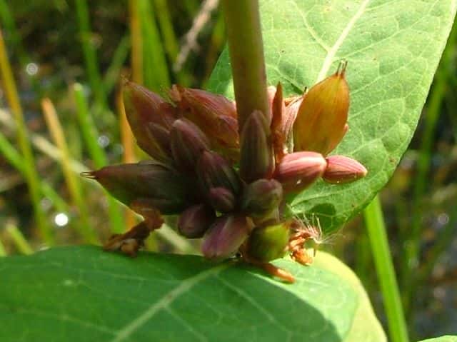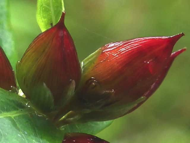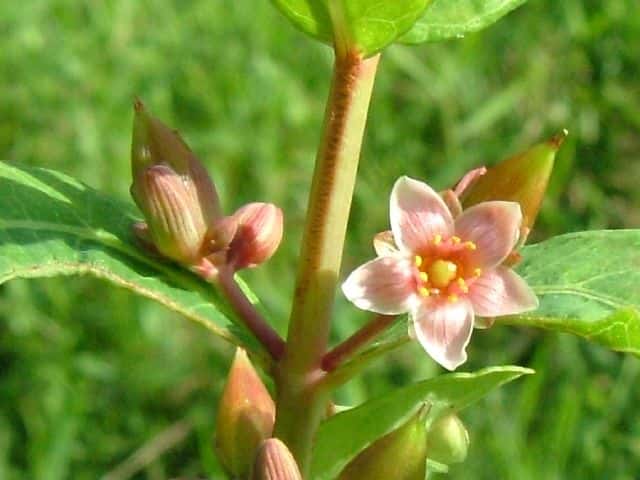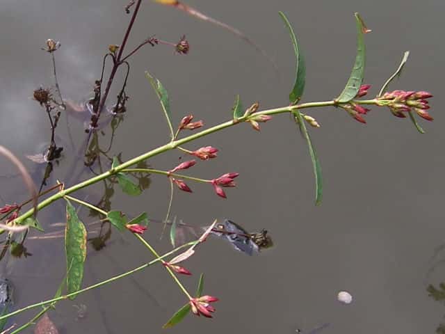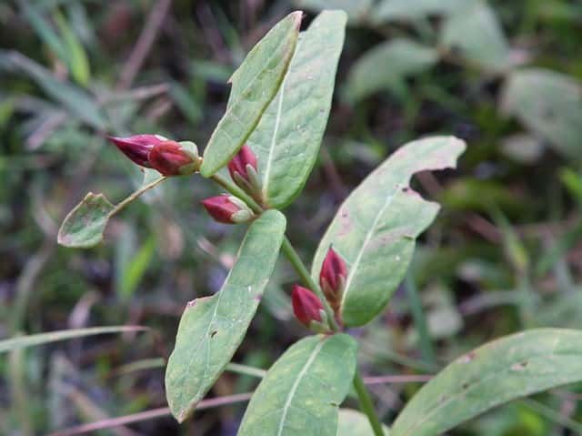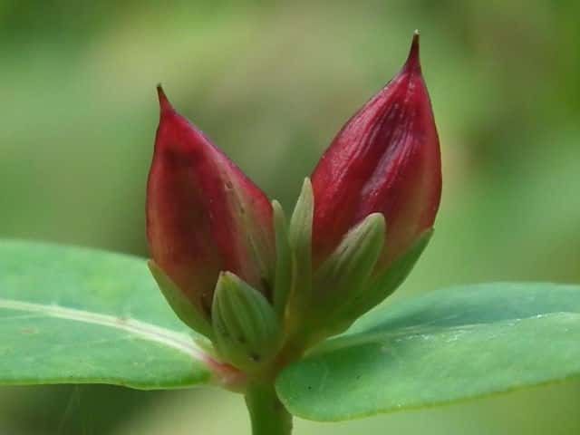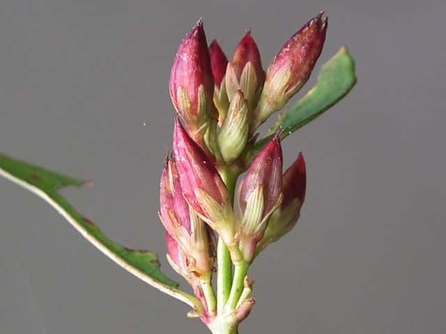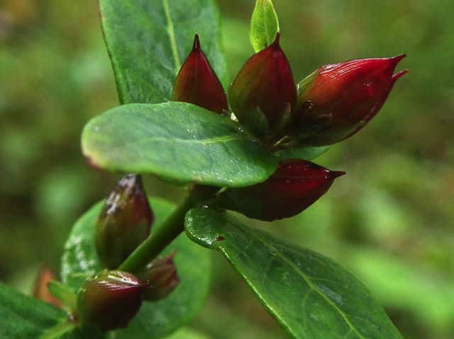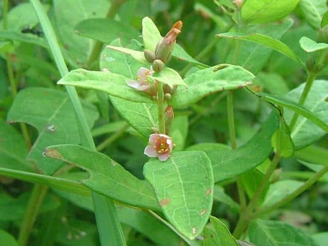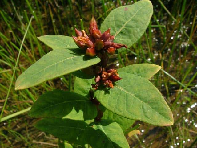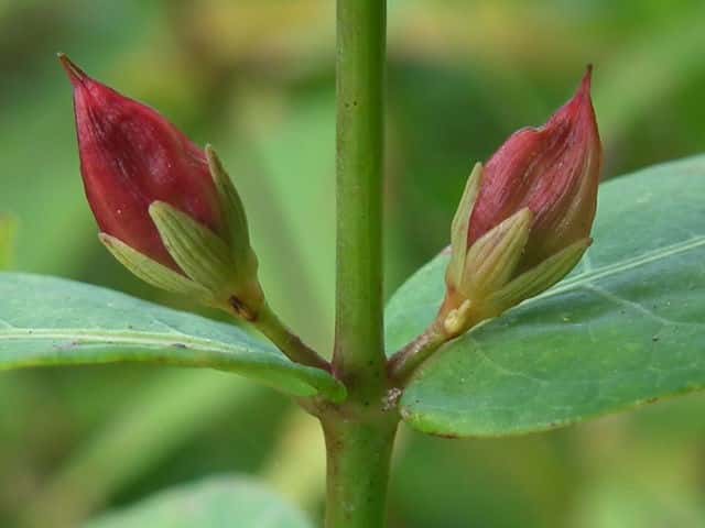 | 多年草 北海道〜九州の池や沼、湿原などに生える。高さ30〜80cm。茎の基部は赤紫色を帯びることが多い。葉は長さ3〜7cm、幅1〜3cmの長楕円形で、明点のみがある。秋に美しく紅葉する。花は淡紅色で直径約1cm。午後になって開き、夕方にはしぼむ。雄しべは9本で、3個ずつが3つの束に分かれる。さく果には明線が入る。 花期は8〜9月。(野に咲く花) 学名は、Triadenum japonicum オトギリソウ科ミズオトギリ属 |