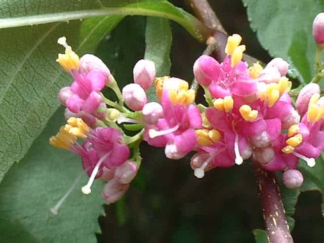 | 落葉低木 北海道〜沖縄の山野の林内や林縁に生える。高さ3mほどになる。樹皮は灰褐色。枝は灰褐色。はじめ細かい星状毛があるが、のちに無毛。皮目は楕円形でやや多い。葉は対生。葉身は長さ6〜13cm、幅2.5〜6cmの長楕円形。先は尾状に尖り、基部は狭いくさび形。縁には細かい鋸歯がある。両面とも無毛。裏面には淡褐色の腺点が散在する。葉柄は長さ2〜7mm。葉腋から集散花序を出し、淡紅紫色の花をつける。花冠は長さ3〜5mm、上部は4裂し、裂片は平開する。雄しべ4個、雌しべ1個。果実は核果。直径3mmほどの球形で、紫色に熟す。核は長さ約2mm。花期は6〜8月。 冬芽は裸芽。頂芽は長さ1〜1.4cm、側芽は長さ5〜10mmの紡錘形で、ともに長さ2〜5mmの柄がある。葉痕は円形〜半円形、維管束痕は1個で突出する。(樹に咲く花) 学名は、Callicarpa japonica シソ科ムラサキシキブ属 よく似た仲間にヤブムラサキやコムラサキがある。またヤブムラサキとの雑種にイヌムラサキシキブがあり、葉の裏面に星状毛が残る。 ムラサキシキブ・・・葉の鋸歯はほぼ全体。花序は腋生かわずかに上から出る。 コムラサキ・・・・・葉の鋸歯は上方のみ。花序は葉腋より少し上から出る。 |