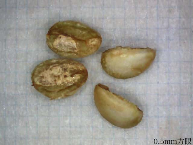 | ▼核は長さ約2.7mm。1〜4個入る。 | ▼核 背面(上)、腹面(下)。 | |