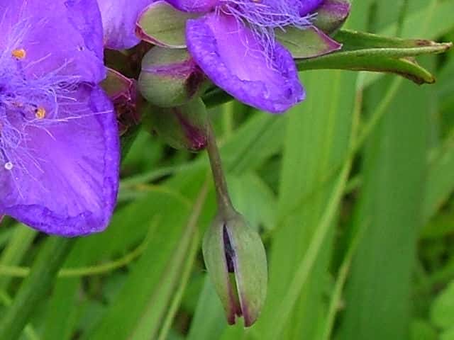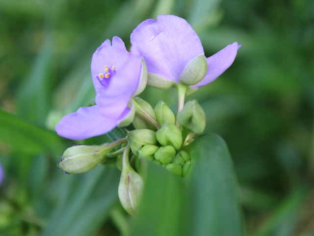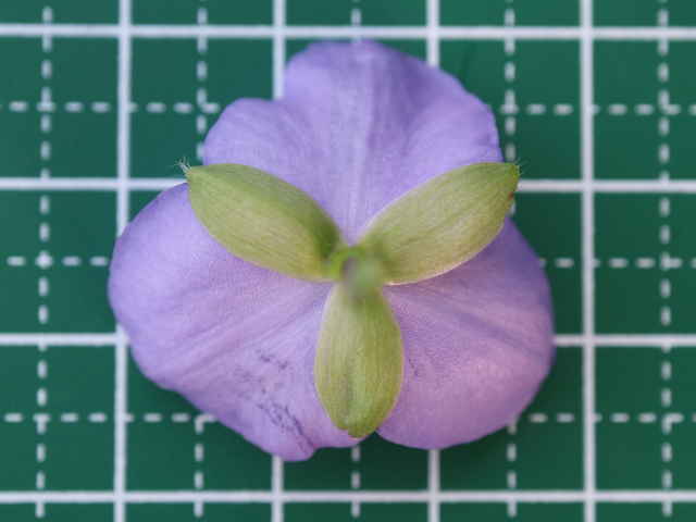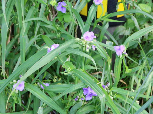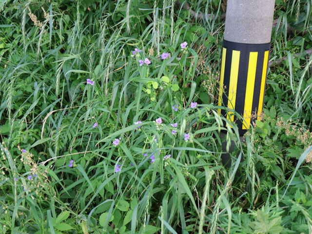 1年草 北アメリカ東部原産。 [三河の野草] 道端や空き地に野生化している。高さ15〜115cm。葉は長さ5〜45cm、幅0.4〜4.5cm、粉白色。葉の気孔が大きく、よく気孔観察に使われる。萼片は3個、粉白を帯び、無毛又は先端に毛があり、長さ4〜15mm。花弁は3個、長さ0.8〜2cm、広卵形、青色〜バラ色、稀に白色。雄しべ6個、花糸が紫色、下部に単細胞幅の細い毛が密生する。さく果は長さ4〜6mm。種子は長さ2〜3mm。花期は6〜9月。 学名は、Tradescantia ohiensis ツユクサ科ムラサキツユクサ属 似た花のオオムラサキツユクサは草丈約5〜35cm、萼片に毛がある。 |