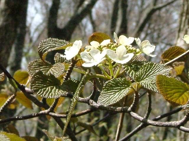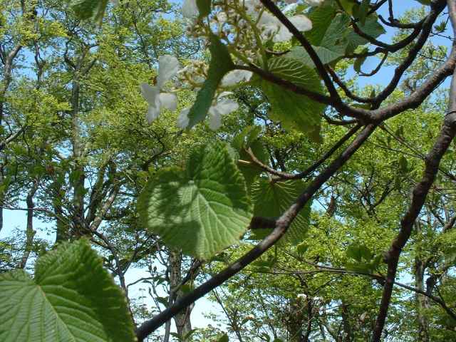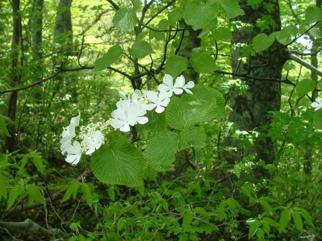| 落葉小高木 北海道〜九州の山地に生える。よく分枝して茂り、高さ6mほどになる。若い枝は褐色、のちに紫褐色。しばしば枝が鹿の角のようにのびる仮軸分枝する。葉は対生。葉身は直径6〜20cmの円形〜広卵形。先は短くとがり、基部はハート形。ふちには小さな不ぞろいの鋸歯がある。側脈は7〜10対あり、裏面に突出する。表面は無毛。裏面は脈上に星状毛が多い。葉柄は長さ1.5〜4cmで、星状毛がある。枝先に直径6〜14cmの散房花序をだし、白い花を多数つける。花序には柄はない。花序の中心部には小さな両性花が集り、そのまわりに直径2〜3cmの白い装飾花がつく。装飾花は5裂して平開する。果実は核果。長さ8〜10mmの広楕円形。8〜10月に赤くなり、花序の枝も赤くなる。果実は完全に熟すと黒くなるが、花序の枝が赤くて目立ち、鳥に果実の存在を知らせる。核は長さ6〜7mm、縦の溝がある。花期は4〜6月。 冬芽は秋までは長さ5〜15mmの披針形の芽鱗に包まれているが、冬には脱落し、長さ1〜2cmの裸芽になり、褐色の星状毛に覆われている。花芽は球形。葉痕は扁平な円形〜ほぼ三角形で、大きくて明瞭。維管束痕は3個。(樹に咲く花) 学名は、Viburnum furcatum ガマズミ科ガマズミ属 |