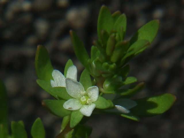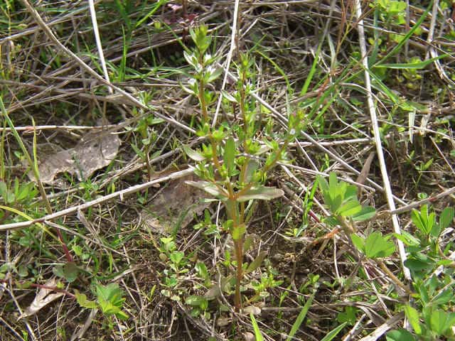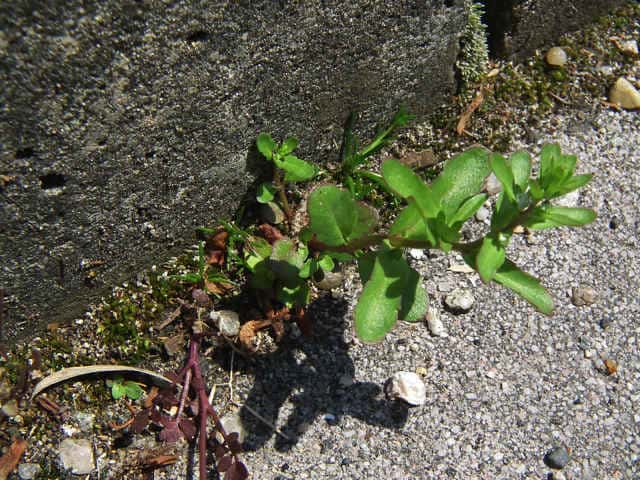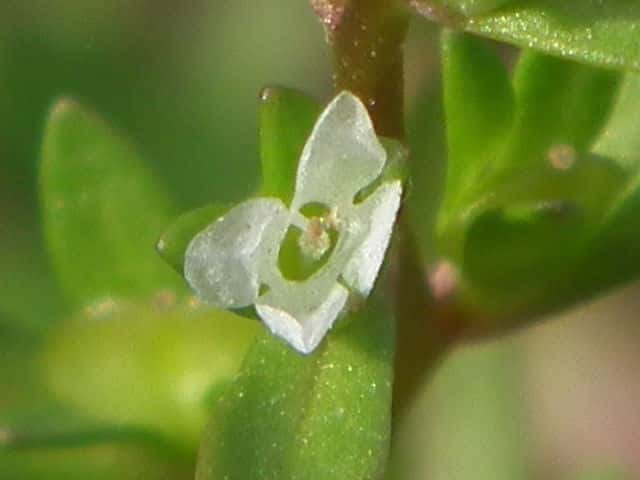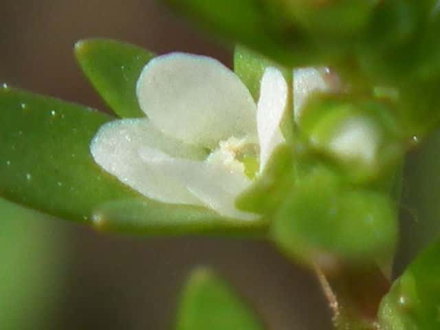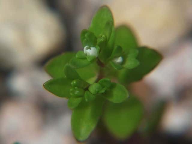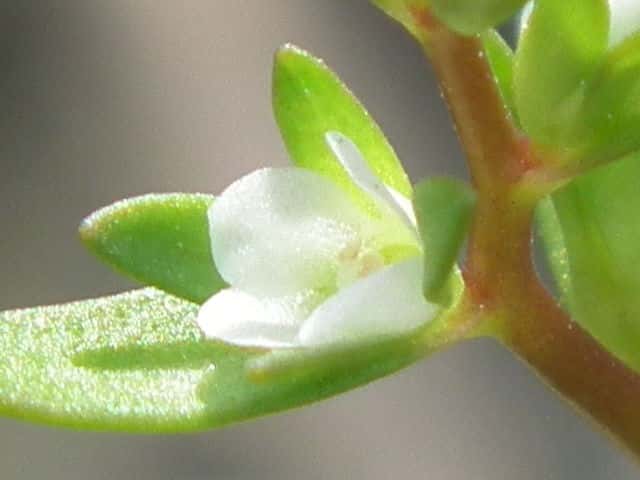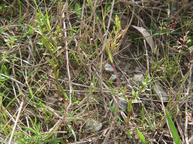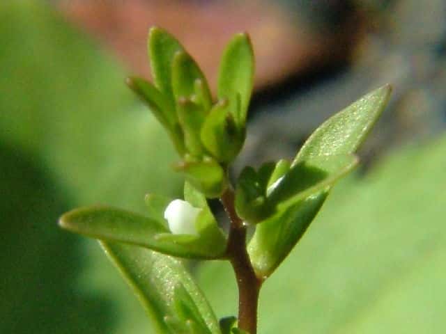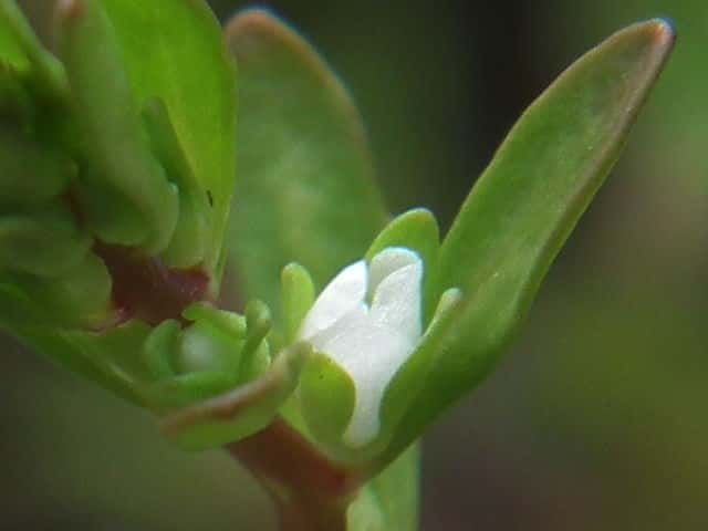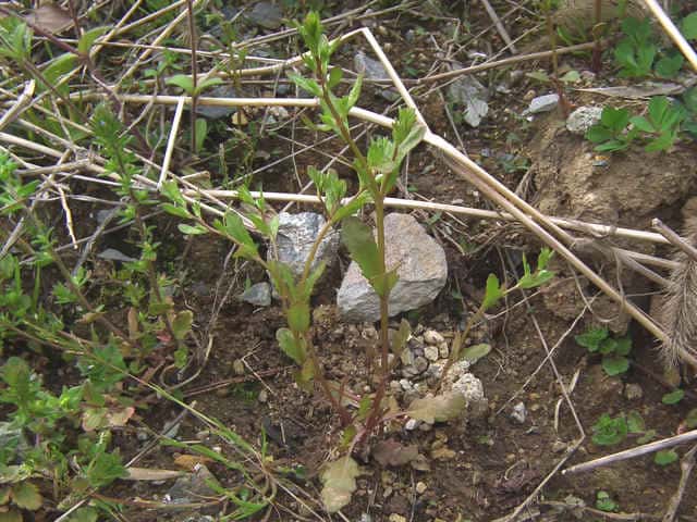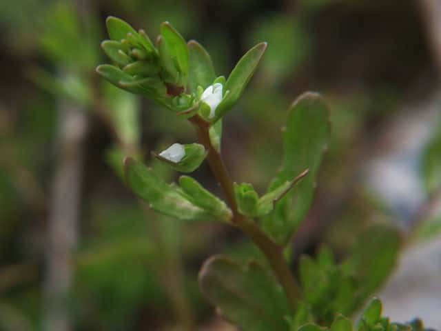 | 1年草 本州〜沖縄の水田や川のそば、海岸に近い湿地などに生える。高さ10〜20cm。茎は無毛かまたはまばらに腺毛が生え、下部でまばらに枝分かれして斜上する。葉は下部では対生し、上部では互生し、長さ0.8〜2.5cm、幅2〜5mmの狭披針形または広線形で、先はやや鈍い。葉腋にわずかに淡紅色を帯びた白色の小さな花を1個つける。花柄はごく短く、1mmぐらいしかない。花冠は直径2〜3mmで、ほとんど基部まで4裂し、2個の雄しべと雌しべ1個がある。子房は2個の球がくっついたような形をしていて、短い花柱がある。萼は葉状で長さ約4mmと花より大きく、深く4裂し、裂片は先端があまりとがらない広披針形。さく果は長さ2〜3mm、幅3〜4mmで平たく、先端がへこんでハート形をしている。種子は平たい楕円形。花期は4〜5月。(野に咲く花) 学名は、Veronica peregrina オオバコ科クワガタソウ属 |