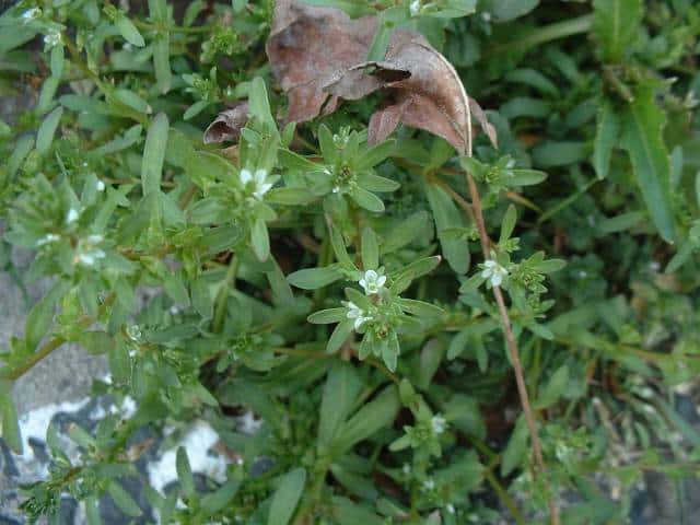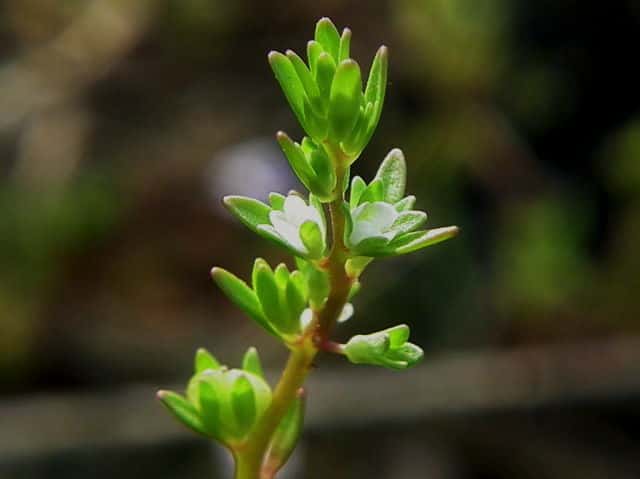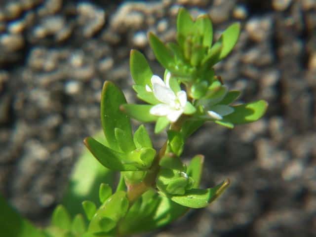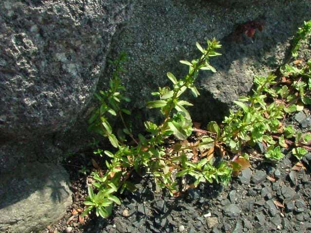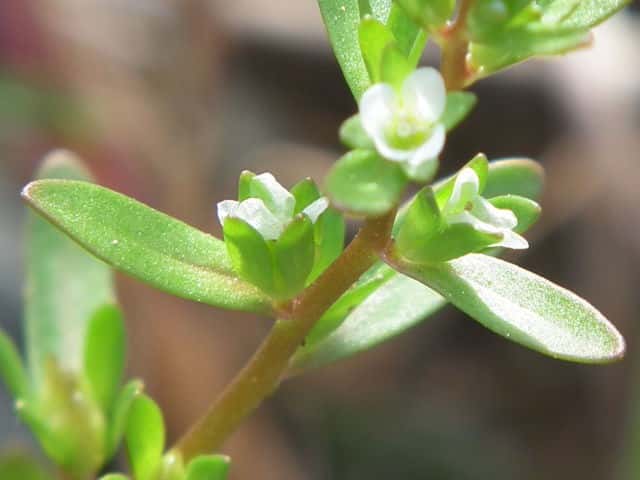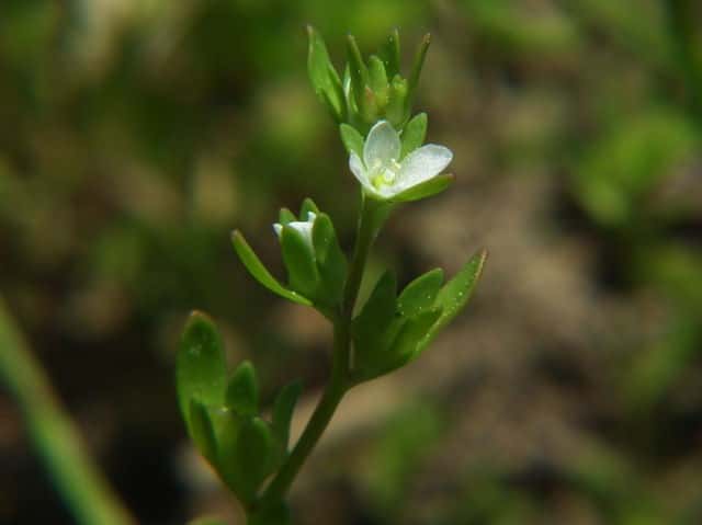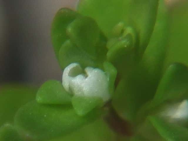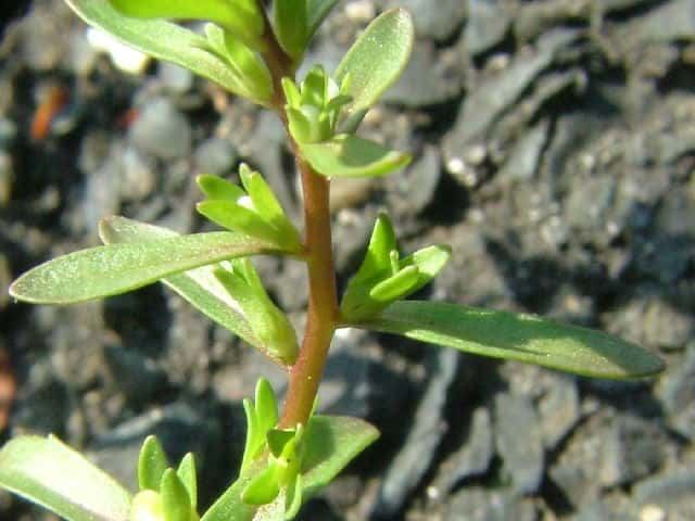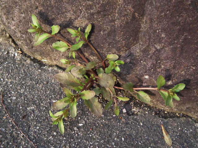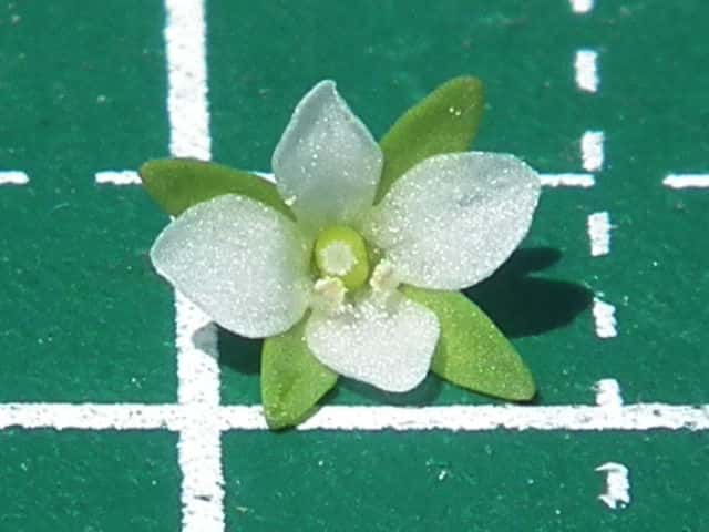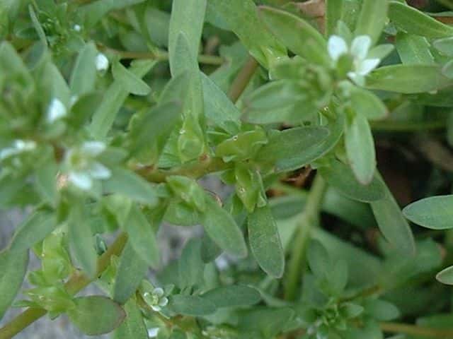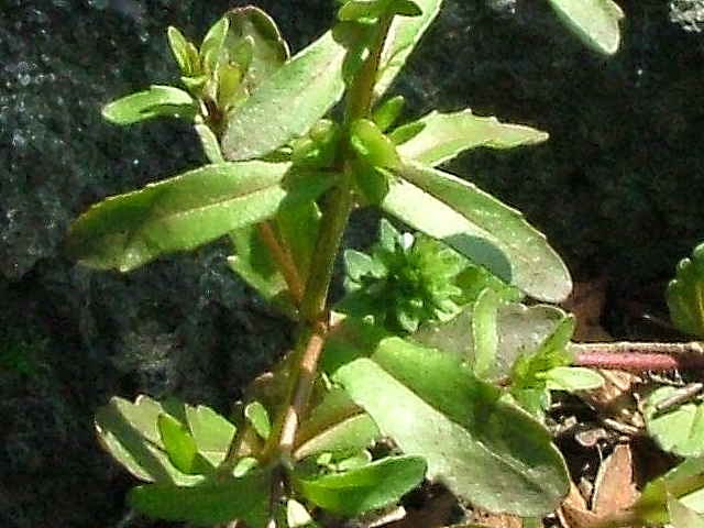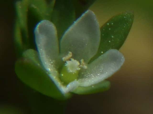 | 1年草 本州〜沖縄の水田や川のそば、海岸に近い湿地などに生える。高さ10〜20cm。茎は無毛かまたはまばらに腺毛が生え、下部でまばらに枝分かれして斜上する。葉は下部では対生し、上部では互生し、長さ0.8〜2.5cm、幅2〜5mmの狭披針形または広線形で、先はやや鈍い。葉腋にわずかに淡紅色を帯びた白色の小さな花を1個つける。花柄はごく短く、1mmぐらいしかない。花冠は直径2〜3mmで、ほとんど基部まで4裂し、2個の雄しべと雌しべ1個がある。子房は2個の球がくっついたような形をしていて、短い花柱がある。萼は葉状で長さ約4mmと花より大きく、深く4裂し、裂片は先端があまりとがらない広披針形。さく果は長さ2〜3mm、幅3〜4mmで平たく、先端がへこんでハート形をしている。種子は平たい楕円形。花期は4〜5月。(野に咲く花) 学名は、Veronica peregrina オオバコ科クワガタソウ属 |