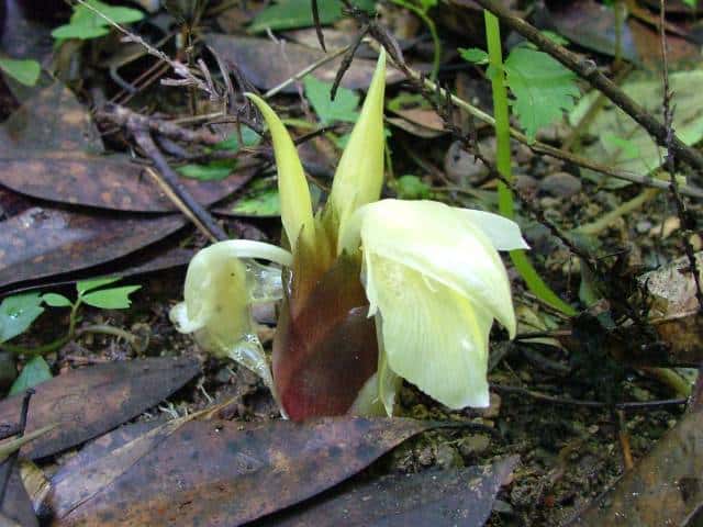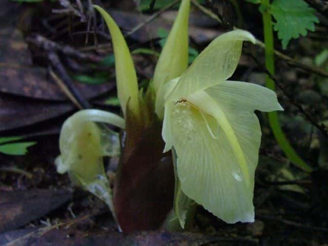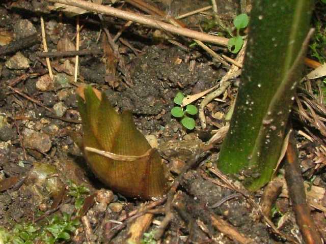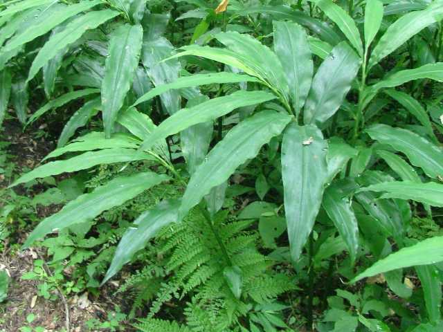多年草 本州〜九州の木陰に生え、また栽培される。生えているのは多くは人の住んだ付近であって、恐らく中国から伝来したものが野生化したのであろう。地下茎は横にはい鱗片葉がある。偽茎は一年生で斜に直立し、高さ40〜100cm、葉身は披針形〜狭長楕円形、長さ20〜30cm、幅3〜6cm、鋭尖頭、基部は短い柄があり、葉鞘は長く互いに重なって偽茎となる。葉舌は、下部の葉では長さ1cm、下部合生し、裂片は卵状披針形、上部の葉では、合生部はほとんどなく、裂片は卵形または広卵形。地下茎の先に鱗片葉に被われた長さ5〜7cm、長楕円形の花序を出して淡黄色の花をつける。苞は狭卵形、鋭尖頭、内部のものは披針形でやわらかい。花は苞の間から次々と出て開き一日でしぼむ。萼は筒状で1方が切れ込み、長さ約2.5cm、花冠は長く伸びて3裂し、裂片は披針形、上側の1個は大きい。唇弁は3裂し側裂片は小さく、中央裂片は大きく舌状。雄しべは1個、約隔の先は長く伸び内に巻いて花柱を包んでいる。花期は8〜10月。(原色日本植物図鑑) 学名は、Zingiber mioga ショウガ科ショウガ属 |