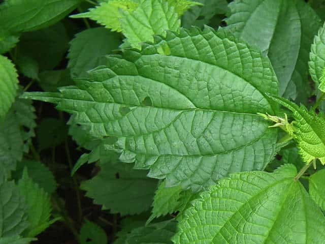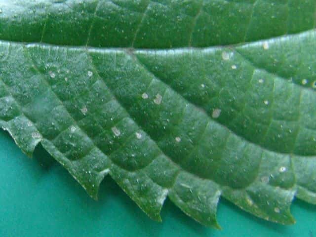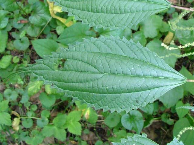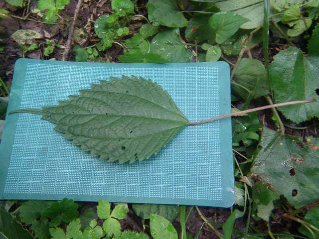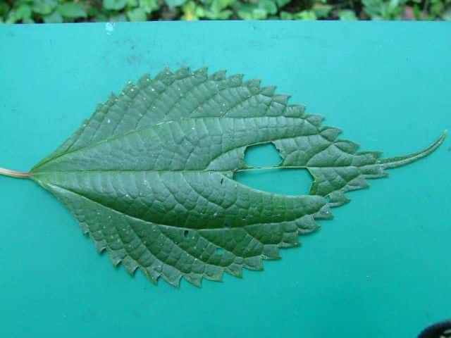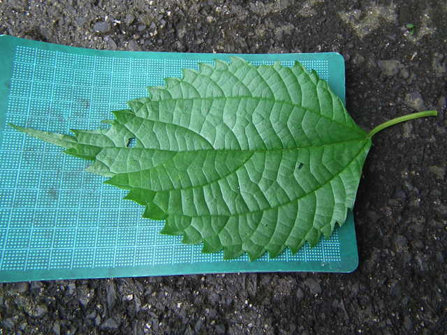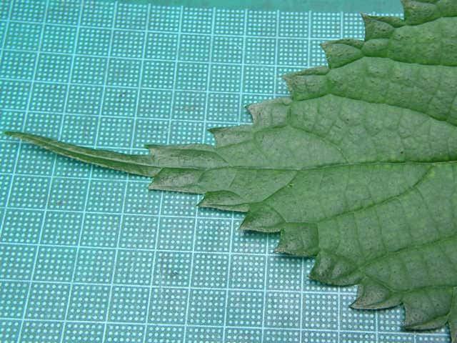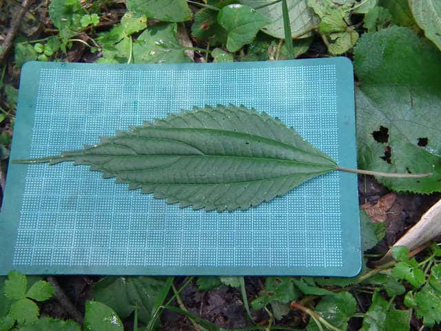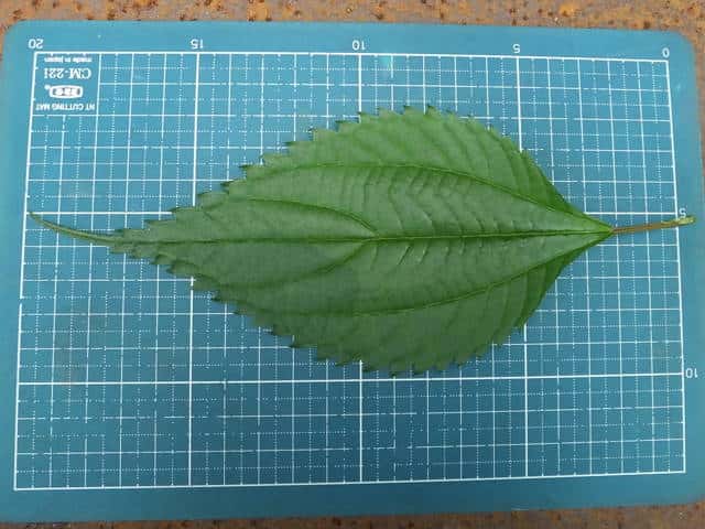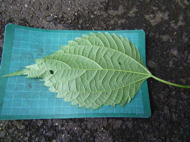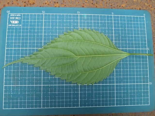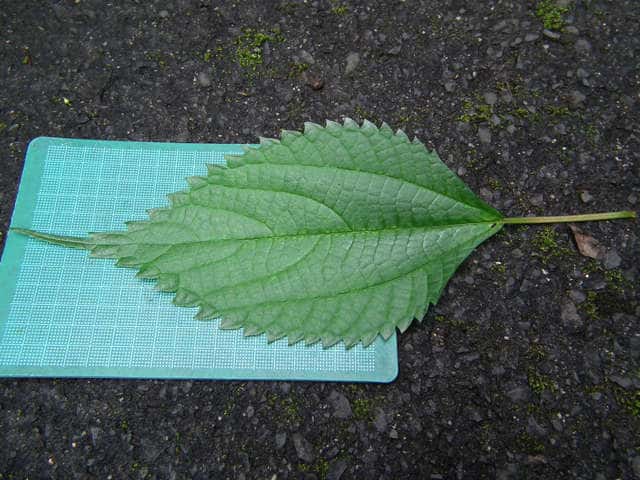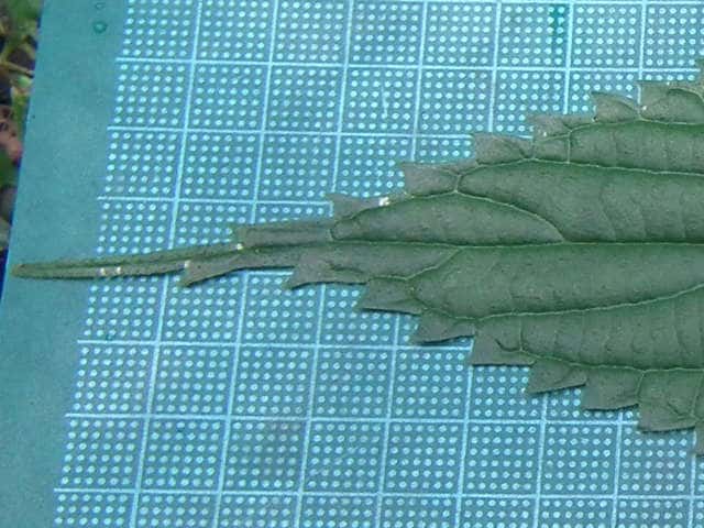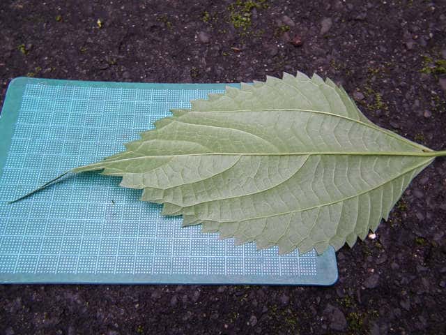 | ▼中部の葉。 | ▼葉身は約23cm×11cm、葉柄は7cm。 | ▼片側20個の鋭い鋸歯がある。 |