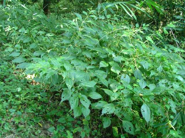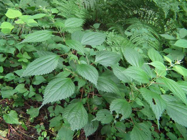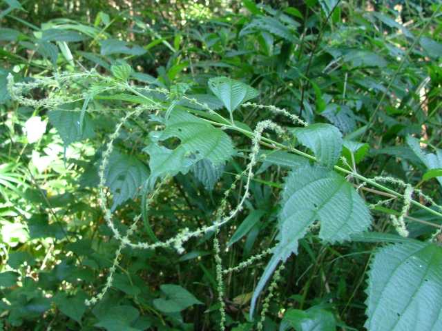 | 多年草 本州(山形県・宮城県以南)〜沖縄の山地に生える。茎は高さ1〜2m、叢生し、鈍4角、葉柄とともに紅色、まばらに寝た短毛がある。葉は対生し、卵状長楕円形、鋭尖頭、ふちにそろった鋭鋸歯があり、3主脈が目立ち、質やや薄く、両面まばらに寝た短毛があり、長さ10〜20cm。葉柄は葉身より短い。下部には雄花序、上部には雌花序を付ける。雄花は球状に集り、花被片4、雄しべ4。雌花も球状に集り、花被筒に包まれた果実は倒卵形または広倒卵形、長さ1.5mm、上部にだけ短毛がある。柱頭は長さ1.5mm。花期は8〜10月。(原色日本植物図鑑) 「発育のよい株の中部の葉(葉身)は長さ約25cm,幅約13cm」(神奈川県植物誌 2001)とあるという。 学名は、Boehmeria sieboldiana イラクサ科ヤブマオ属 葉の広いものをヒロナガバヤブマオとされるようだが、詳細が不明。 |