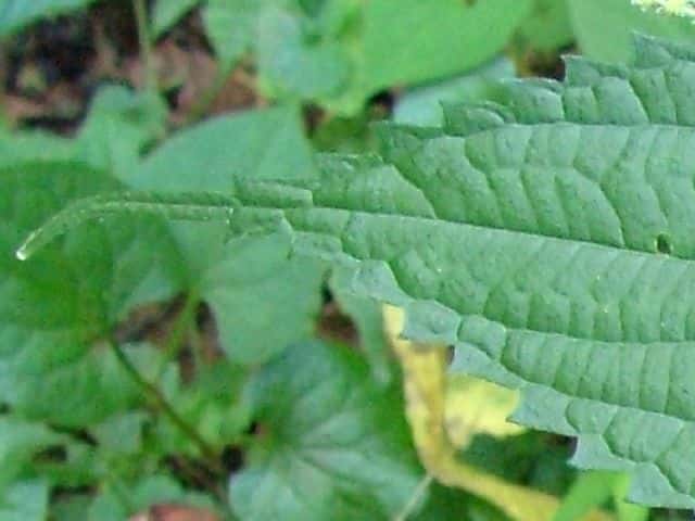 | ▼片側16個の鋸歯がある。 | ▼中部の葉はおおむね幅が11cm。 | ▼茎は稜があり無毛。 |