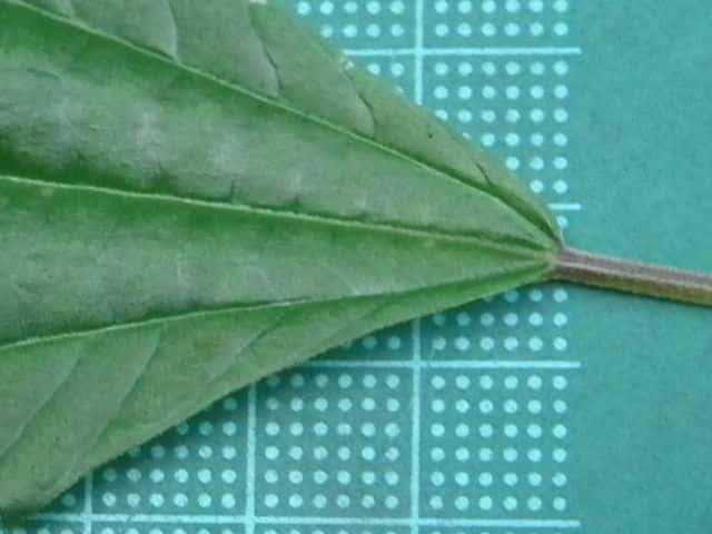 | ▼葉身は長さ約18cm。 | ▼葉は対生し、葉柄が長いが、葉身より短い。 | |
