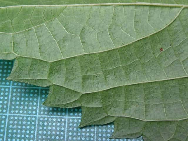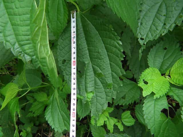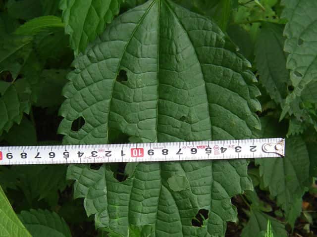 | ▼下部の大きな葉。 | ▼葉身は25×17cm。片側17個の鋸歯がある。 | v表面はほぼ無毛。 |