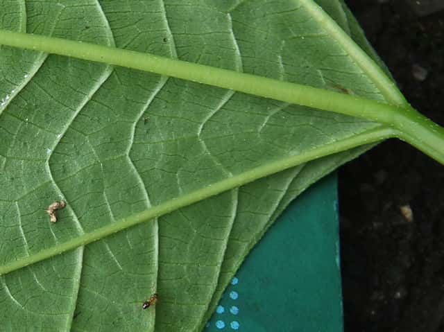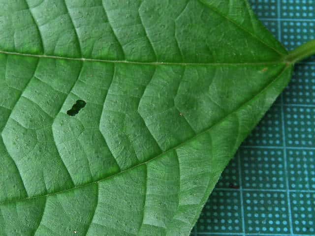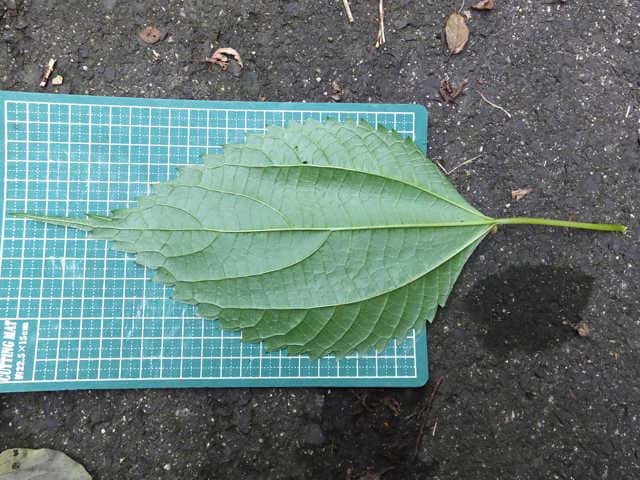 | ▼葉身は長さ約24cm、幅約13cm、葉柄は長さ約7cm。表面は無毛。 | ||
