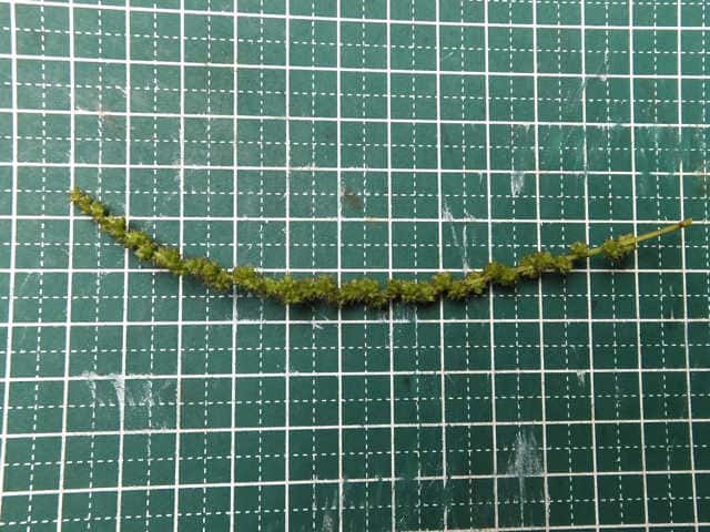 | ▼穂状花序は長さ約16cm。 | ▼花柱を伸ばした雌花。 | ▼葉の先は長く尖る。 |