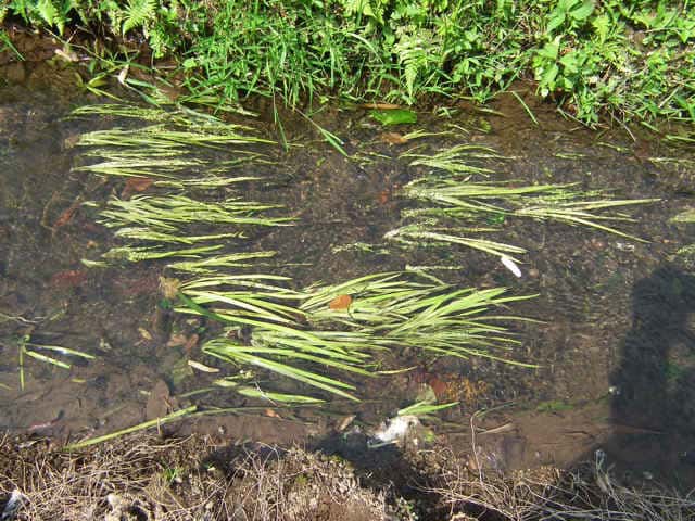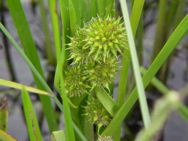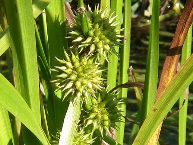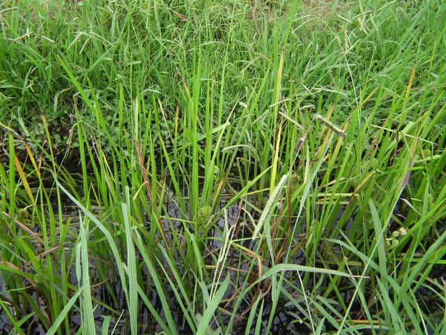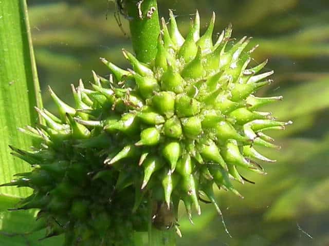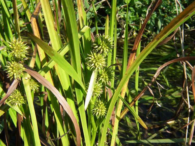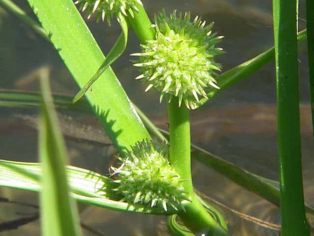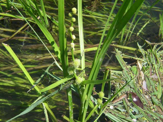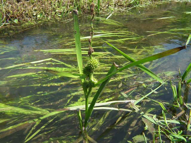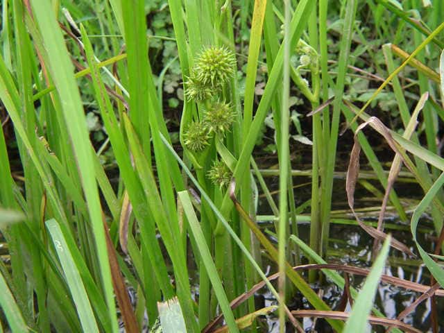 多年草 北海道南西部〜九州の湖沼やため池、河川、水路などに生育する抽水植物。湧水河川に特に多く、しばしば流れになびく沈水形〜浮葉形となる。全高70〜130cm、横たわると全長150cmを超えることもある。葉は幅(5〜)8〜14mm、抽水葉では背稜が顕著で断面は三角状だが、浮葉や沈水葉では背稜が目立たなくなる。この状態がしばしばセキショウモと誤認されるが、葉脈のパターンと葉縁に鋸歯がないことで区別できる。花序は分枝しない。 雌性頭花は3〜7個で、少なくとも下側の1〜3個は長さ7〜50mmの柄があり、主軸とは合着しない(腋性)。上側の頭花は着性になるが、中間の頭花はときに腋上性を示す。果時には直径1.5〜2cmになり、上部の頭花は接近する。雄性頭花は4〜9個で、雌性頭花からは離れてつく。果実は紡錘形で長さ4〜6mm、幅約2mm、全体に流線形で他種の果実に比べ細長く、先端は嘴状に尖る。花期は6〜9月。(日本の水草) 学名は、Sparganium japonicum ガマ科ミクリ属 |