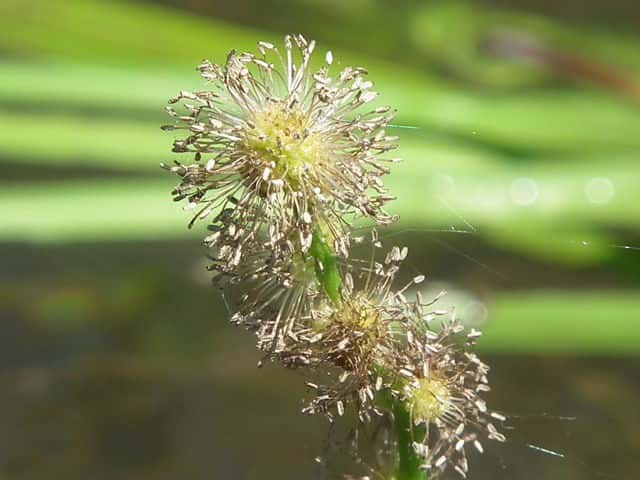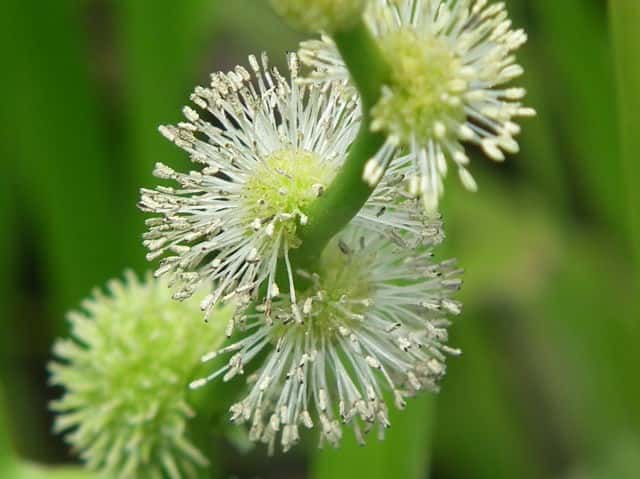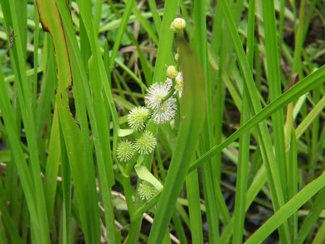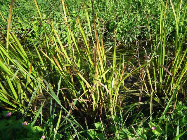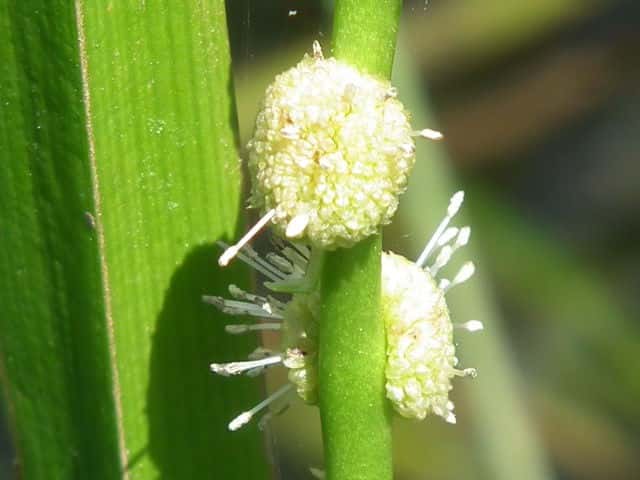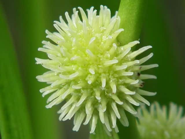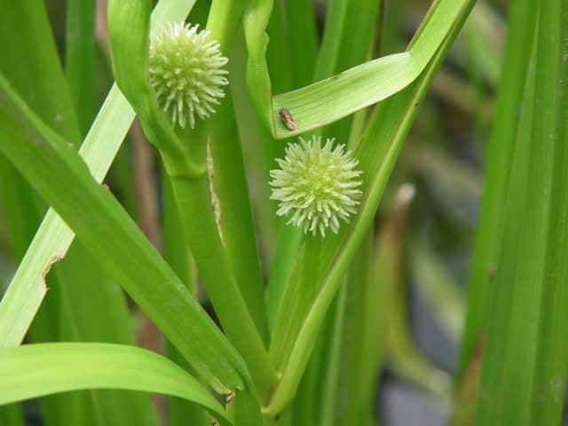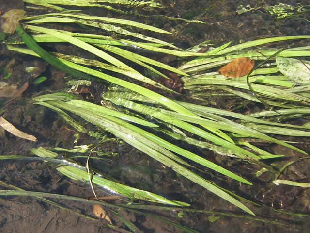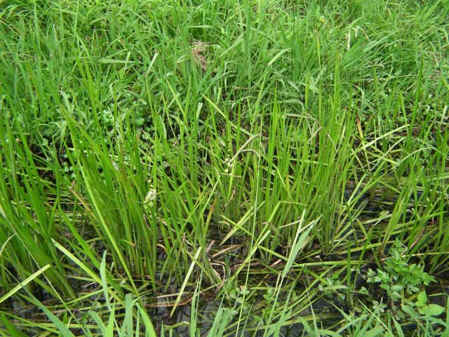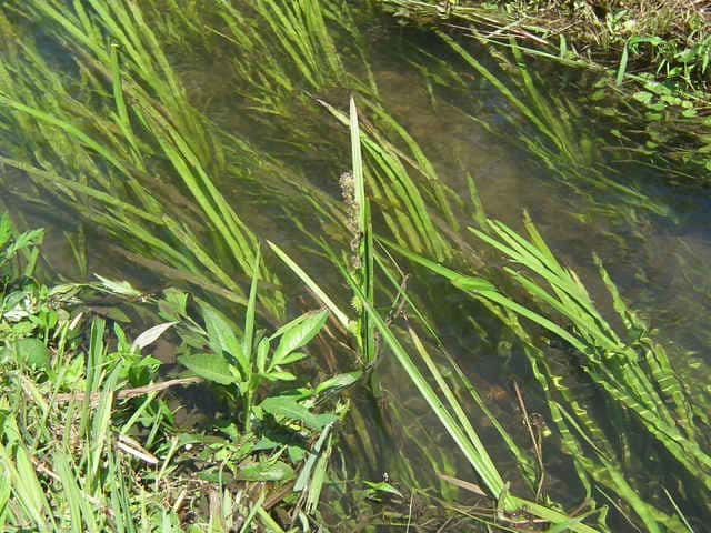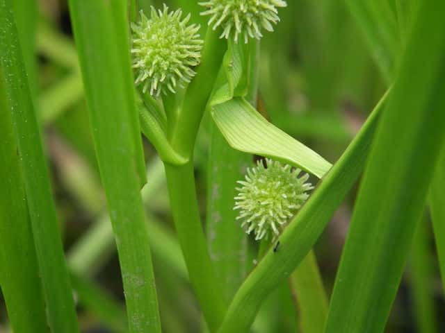 多年草 北海道南西部〜九州の湖沼やため池、河川、水路などに生育する抽水植物。湧水河川に特に多く、しばしば流れになびく沈水形〜浮葉形となる。全高70〜130cm、横たわると全長150cmを超えることもある。葉は幅(5〜)8〜14mm、抽水葉では背稜が顕著で断面は三角状だが、浮葉や沈水葉では背稜が目立たなくなる。この状態がしばしばセキショウモと誤認されるが、葉脈のパターンと葉縁に鋸歯がないことで区別できる。花序は分枝しない。 雌性頭花は3〜7個で、少なくとも下側の1〜3個は長さ7〜50mmの柄があり、主軸とは合着しない(腋性)。上側の頭花は着性になるが、中間の頭花はときに腋上性を示す。果時には直径1.5〜2cmになり、上部の頭花は接近する。雄性頭花は4〜9個で、雌性頭花からは離れてつく。果実は紡錘形で長さ4〜6mm、幅約2mm、全体に流線形で他種の果実に比べ細長く、先端は嘴状に尖る。花期は6〜9月。(日本の水草) 学名は、Sparganium japonicum ガマ科ミクリ属 |
