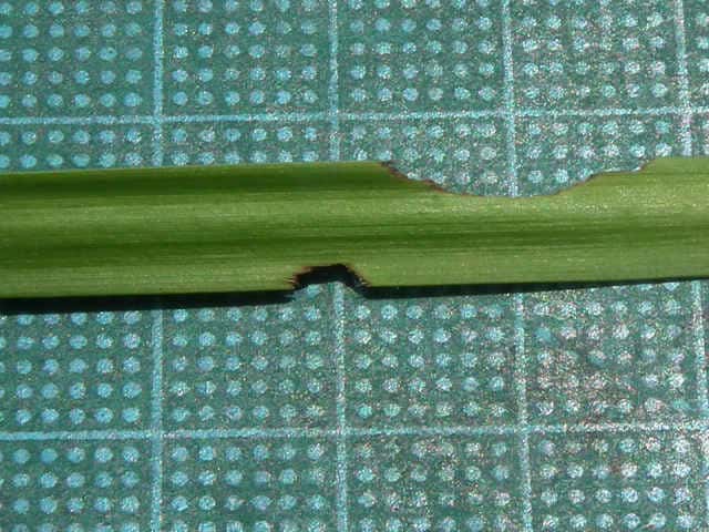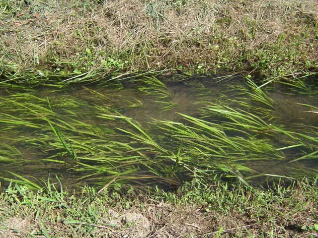 | ▼抽水葉の表面。葉の幅は約8mm。 | ▼抽水葉の裏面には稜がある。 | ▼抽水葉の断面。 |