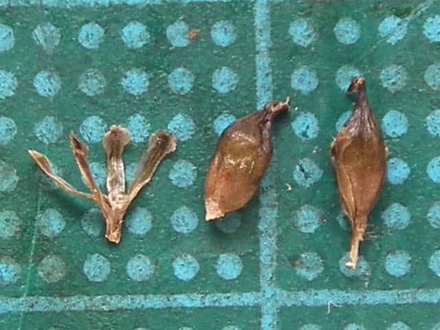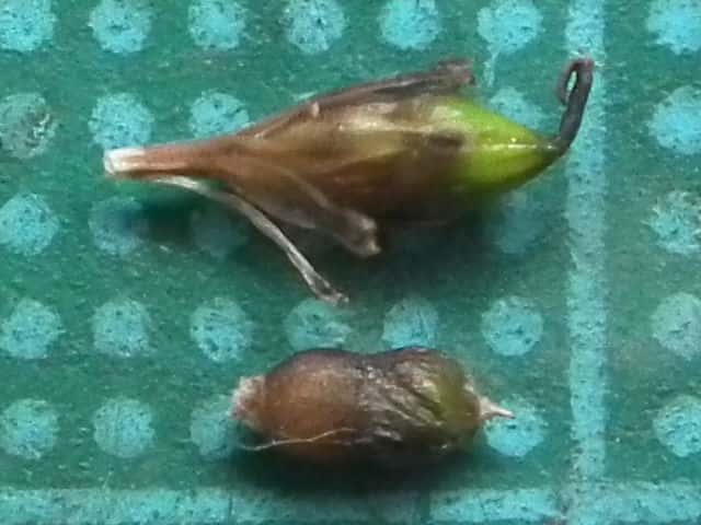 | ▼花被に包まれた果実。 | ▼花被(左)、果実は紡錘形、長さ約4mm。 | |