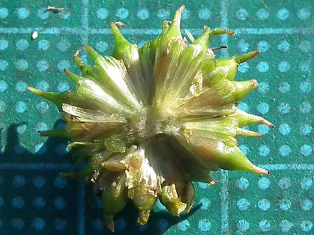 | ▼直径約1.8cm。 | ▼横断面。果実の下部に花被片がある。 | ▼花被片が下半部に残る。先端が嘴状に尖る。 |