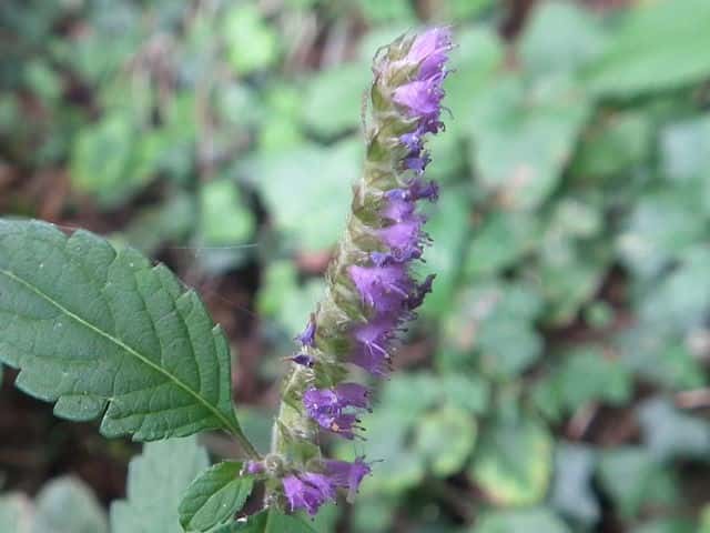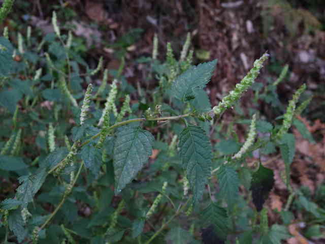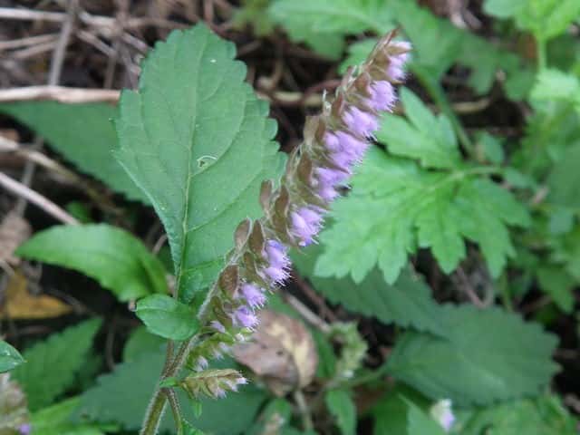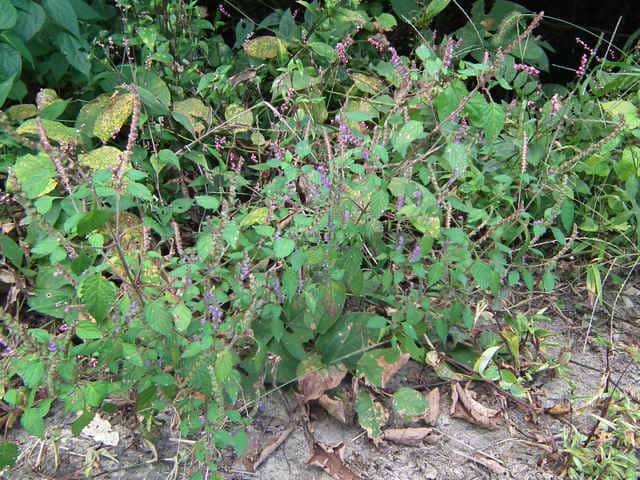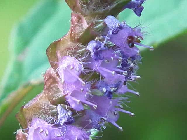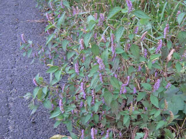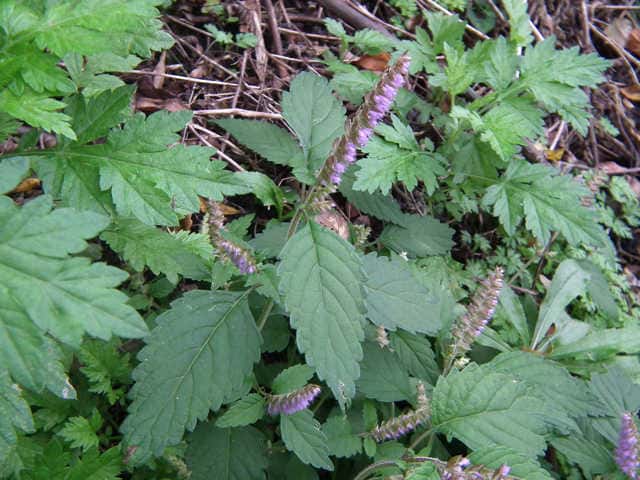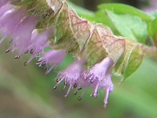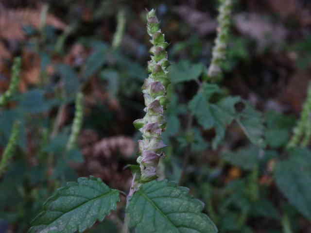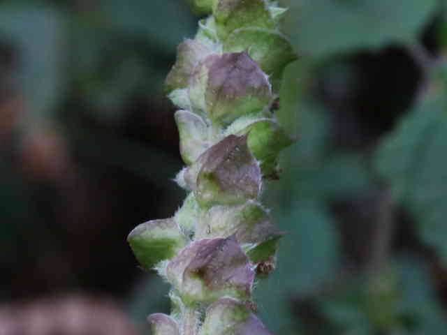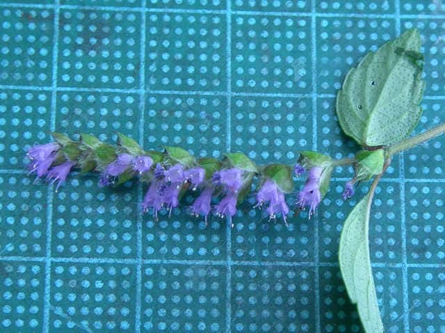 | 1年草 北海道〜九州の山地や道ばたに生える。高さ30〜60cm。全体に強い香りがする。葉は対生し、長さ3〜9cm、幅1〜4cmの卵形〜狭卵形で先はとがり、ふちには鋸歯がある。枝先に花穂をだし、淡紅紫色の小さな花をつける。花冠は長さ約5mmの唇形で、ふちは細かく裂け、毛が生えているように見える。花の反対側に苞が整然と並び、苞は中心部がもっとも幅広く、ふちには短毛があるが、背面は無毛。花期は9〜10月。(野に咲く花) 学名は、Elsholtzia ciliata シソ科ナギナタコウジュ属 |