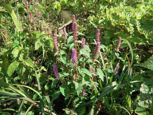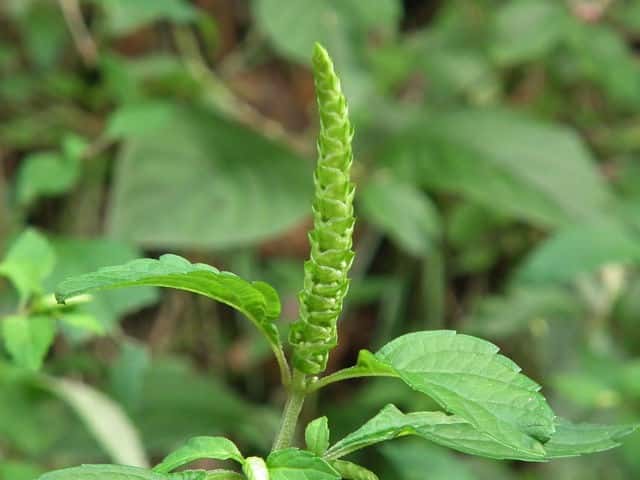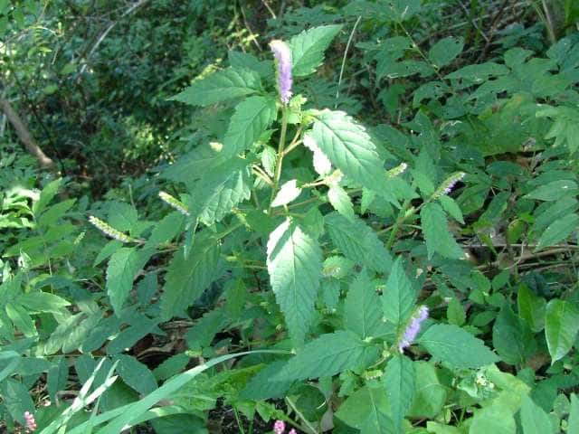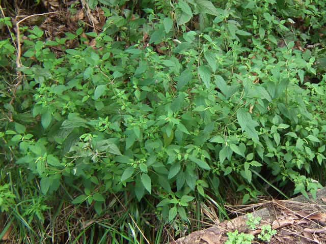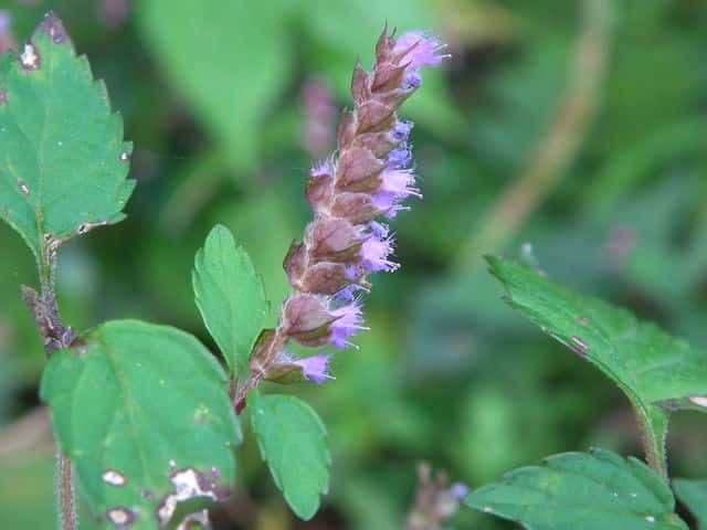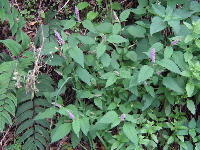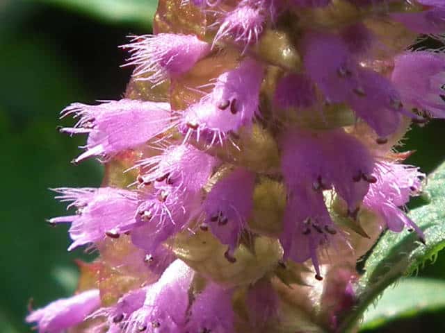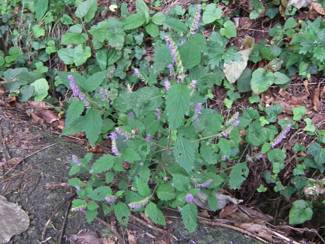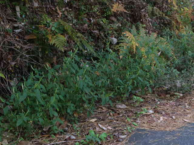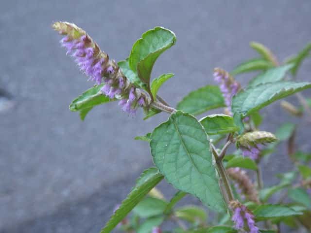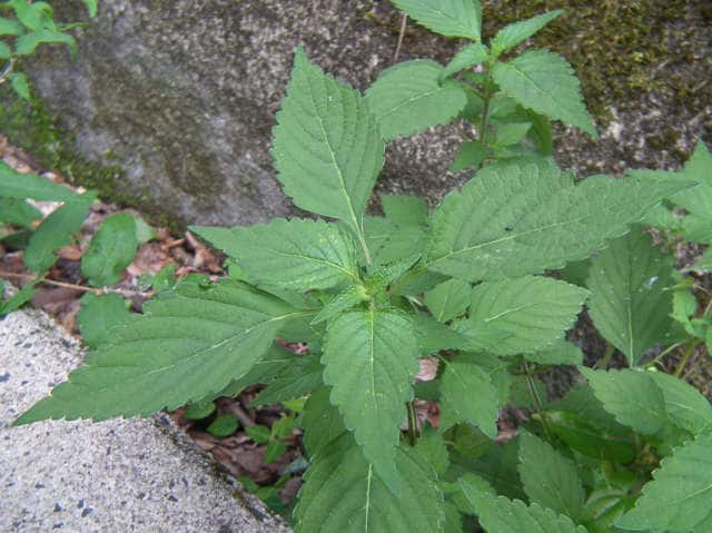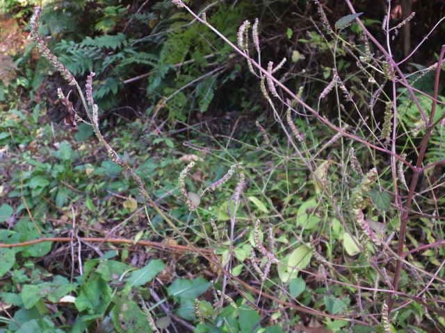 | 1年草 北海道〜九州の山地や道ばたに生える。高さ30〜60cm。全体に強い香りがする。葉は対生し、長さ3〜9cm、幅1〜4cmの卵形〜狭卵形で先はとがり、ふちには鋸歯がある。枝先に花穂をだし、淡紅紫色の小さな花をつける。花冠は長さ約5mmの唇形で、ふちは細かく裂け、毛が生えているように見える。花の反対側に苞が整然と並び、苞は中心部がもっとも幅広く、ふちには短毛があるが、背面は無毛。花期は9〜10月。(野に咲く花) 学名は、Elsholtzia ciliata シソ科ナギナタコウジュ属 |