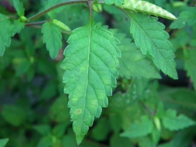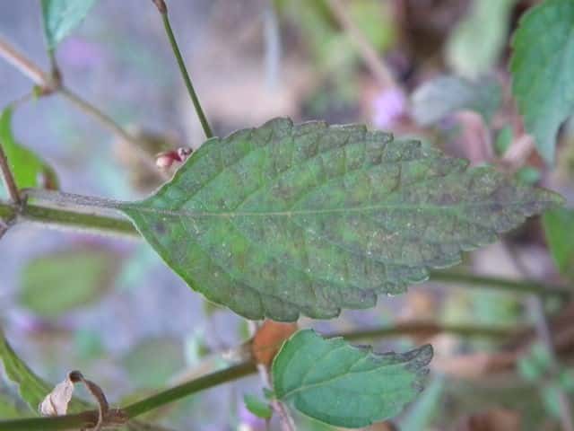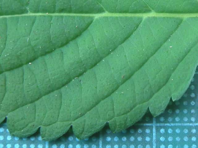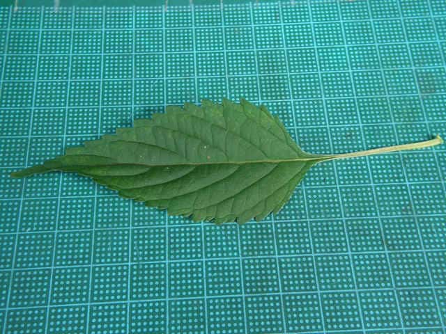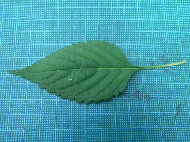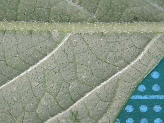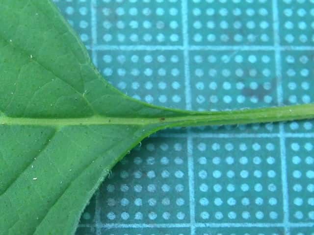 | ▼葉の基部はくさび形で葉柄に流れる。 | ▼葉の裏面に腺点がある。 | |