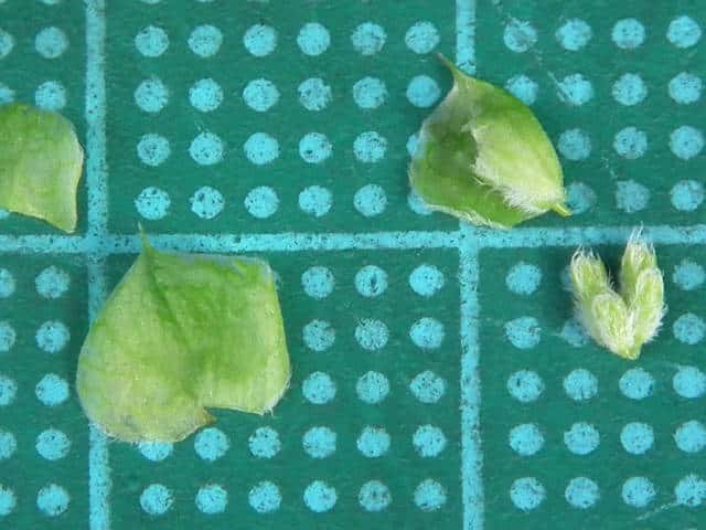 | ▼苞 | ▼1つの苞に5個の花がつく。 | ▼苞の縁に短毛があるが、背面は無毛。 |