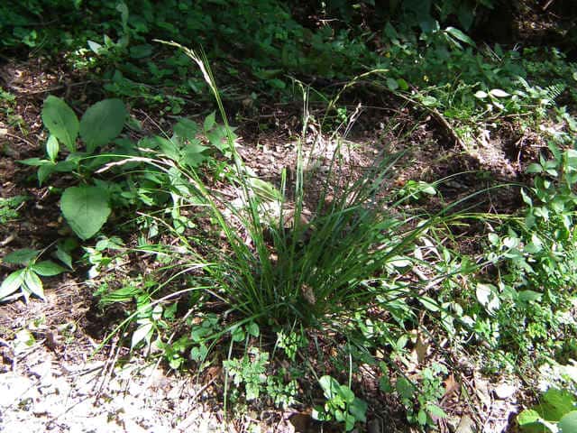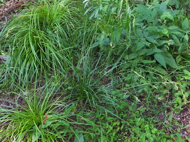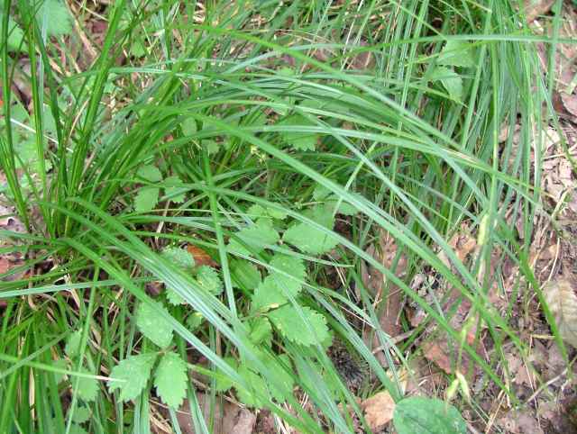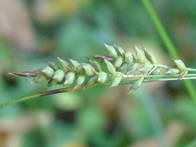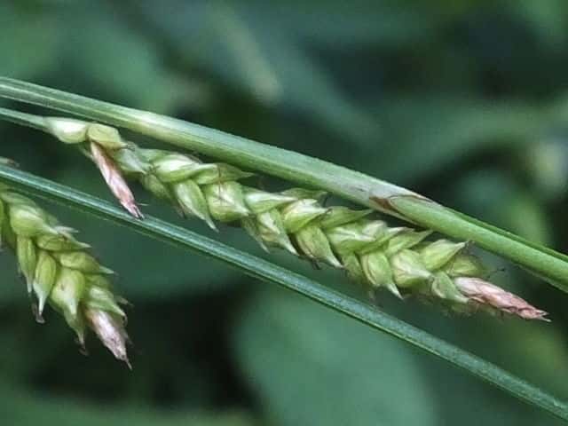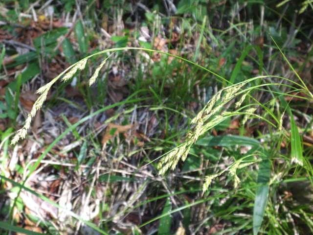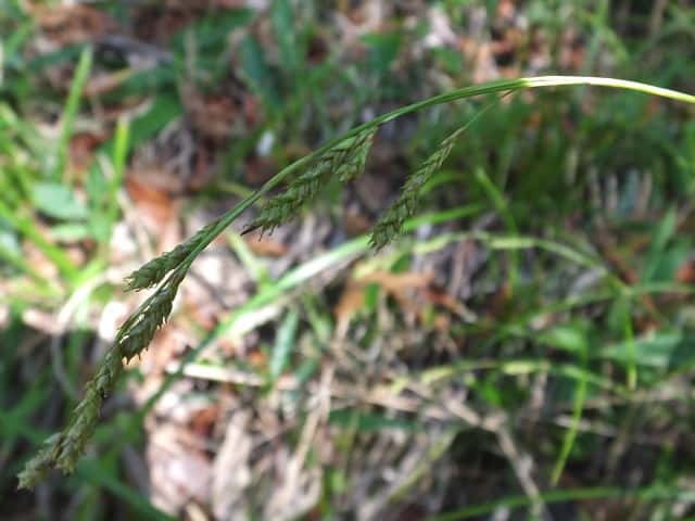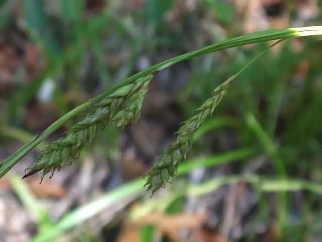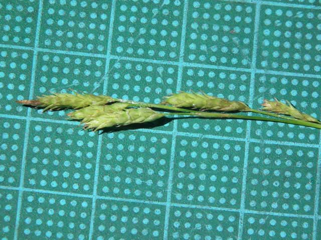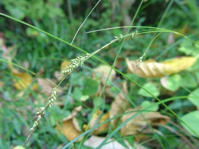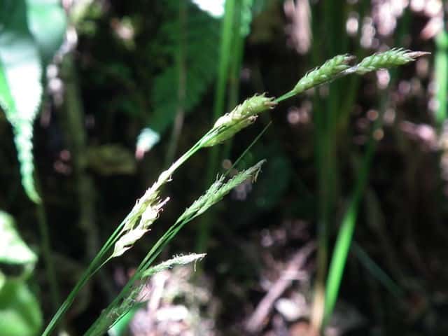 | 常緑多年草。 関東・新潟県以西〜九州の平地から低山地の樹林内や林縁林床や林縁に生える。根茎は短く叢生し、匐枝は出さない。基部の鞘は葉身があり、濃褐色で後に繊維に分解する。葉は硬く濃緑色、幅2〜4mm。有花茎は高さ40〜80cm。苞は有鞘、上方のものは刺状、下方のものは小穂より長い葉身がある。小穂は1節に1〜3個つけ、ときに枝を分け、長さ1〜2cm、幅3〜3.5mm、すべて雄雌性で、雄花部は短い。果胞は長さ2.8〜3.5mm、脈が目立ち、やや開出した短毛がある。柱頭は2岐、果実の断面はレンズ状。果期は9〜11月。(日本のスゲ) 学名は、Carex lenta カヤツリグサ科スゲ属ナキリスゲ節 よく似たコゴメスゲは果胞が長さ2.5〜3mm、ナキリスゲは2.8〜3.5mm。匍匐枝はなく大株となる。センダイスゲは長い匍匐根茎があり疎らに生え、果胞は長さ3〜3.5mm。 |