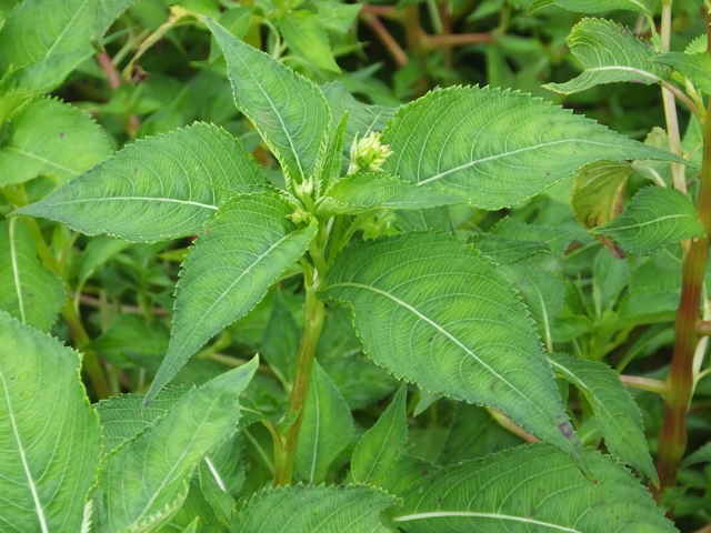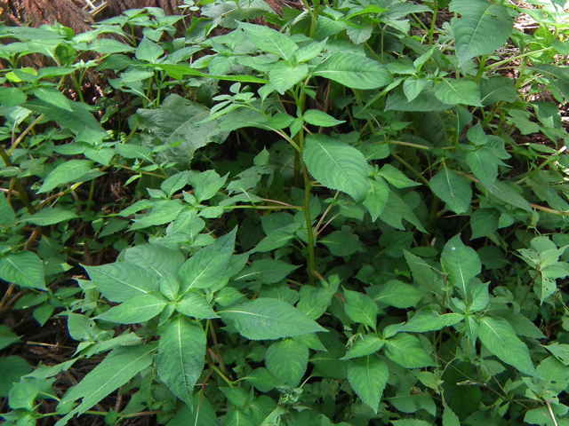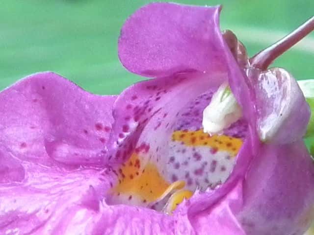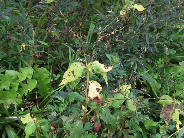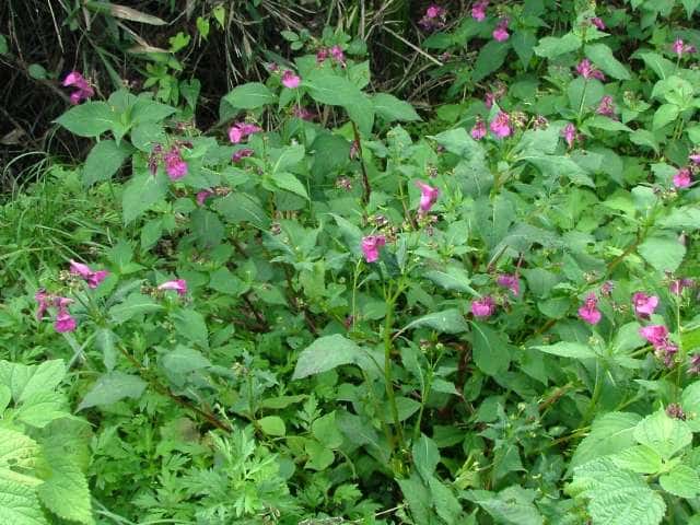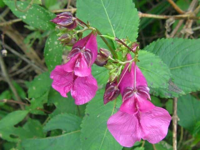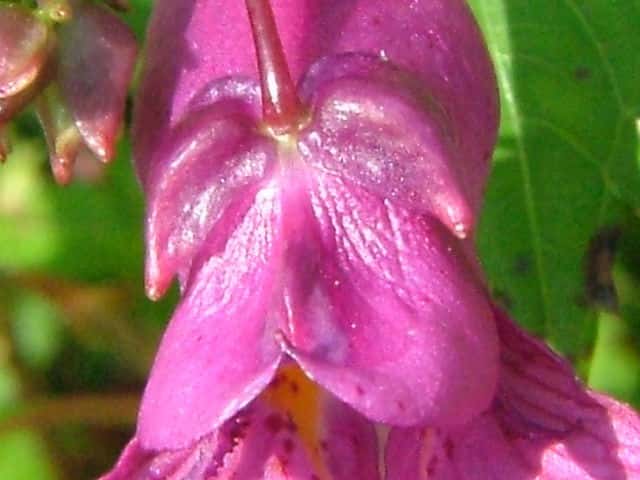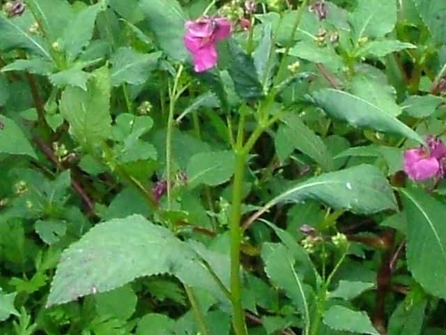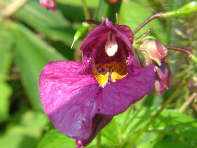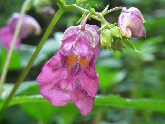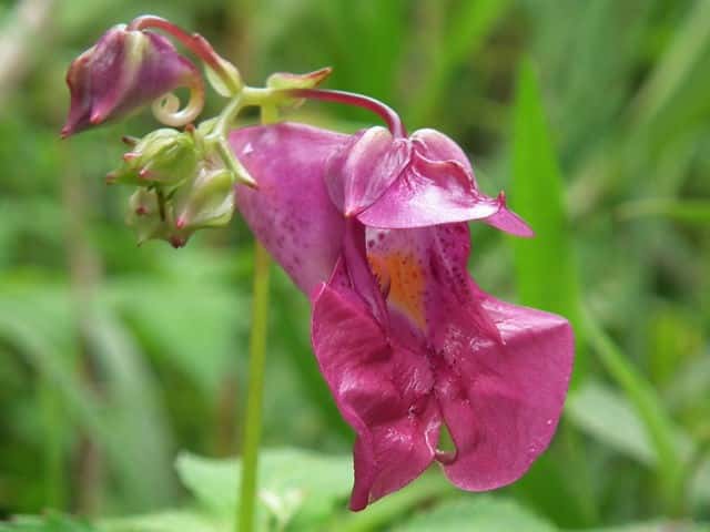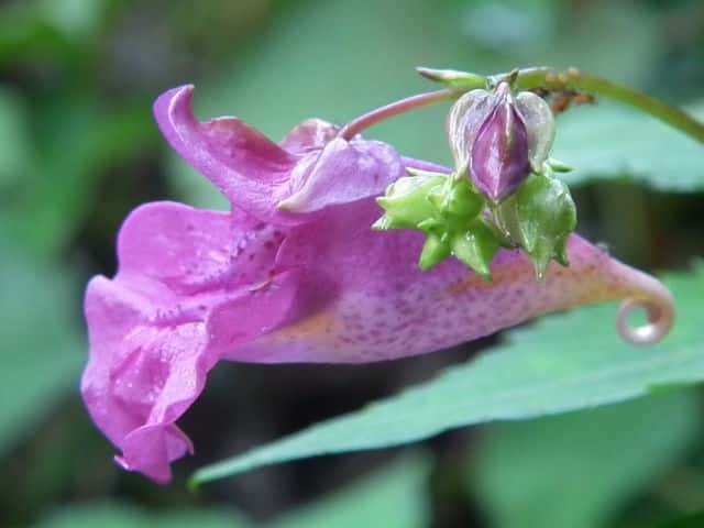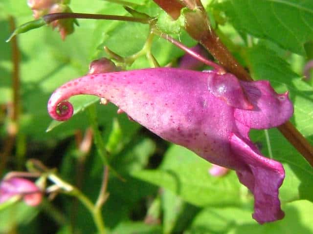 | 1年草 北海道〜九州のやや湿ったところに多い。ツリフネソウの一品種であり、花軸の下部に毛がないものをいい、他の部分は同様。茎はやや赤みを帯び、節がふくらむ。葉は互生し、長さ5〜13cmの菱状楕円形で細かい鋸歯がある。全体に無毛。花序は葉腋から斜上し、紅紫色の花を数個つける。花弁3個、萼片3個。萼片も紅紫色で花弁のようにみえ、下の1個は大きく袋状になり、その先端は細長い踞となって、クルリと巻く。花弁は下の2個が大きくて黄色の斑点がある。雄しべは5個で、花糸は短く、葯が合着して雌しべを包み込んでいる。果実は肉質のさく果、長さ1〜2cm。熟すと果皮が5片にはじけて巻き、種子を飛ばす。別名 トガクシツリフネ。 花期は7〜10月。 学名は、Impatiens textori f. nudipedicellata ツリフネソウ科ツリフネソウ属 花軸の下部に毛のあるものをツリフネソウ(Impatiens textorii)と呼ぶ。 |