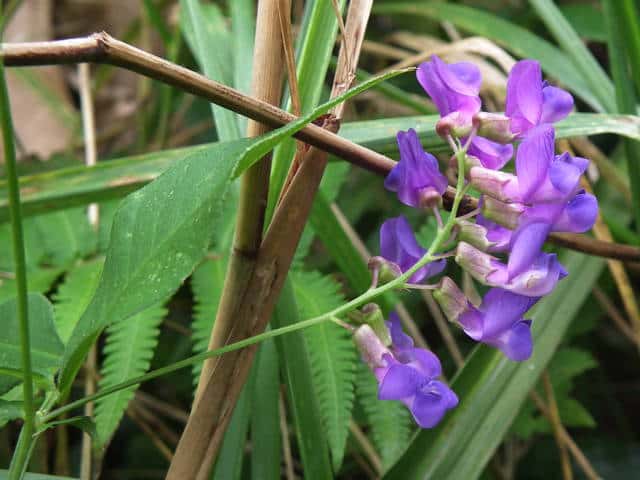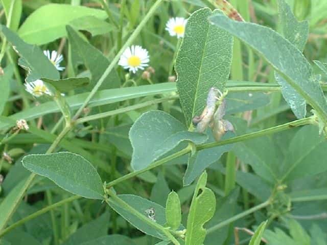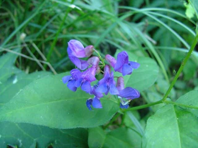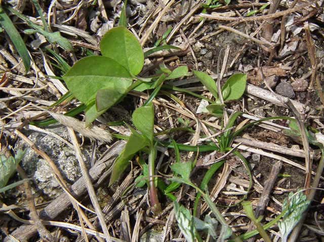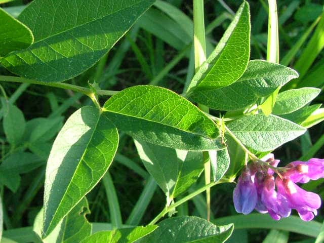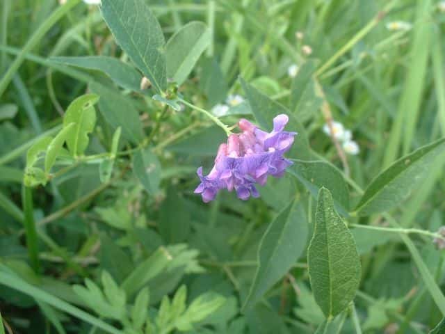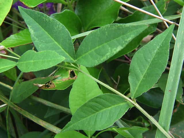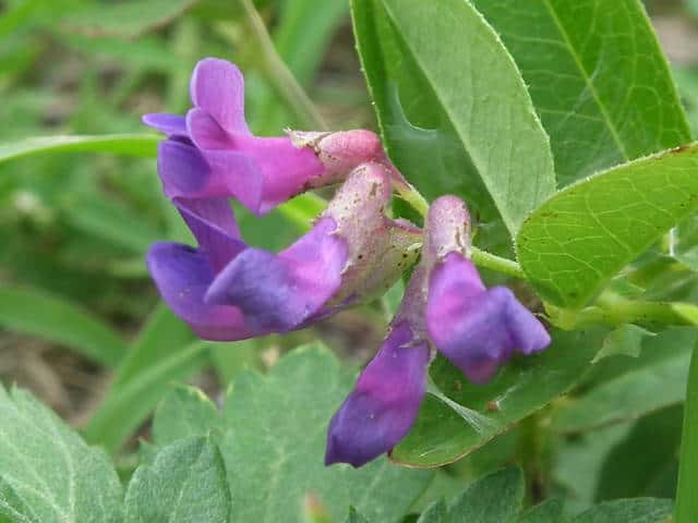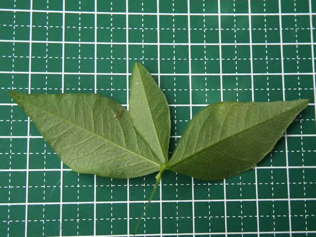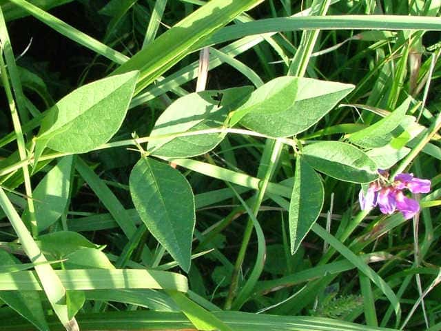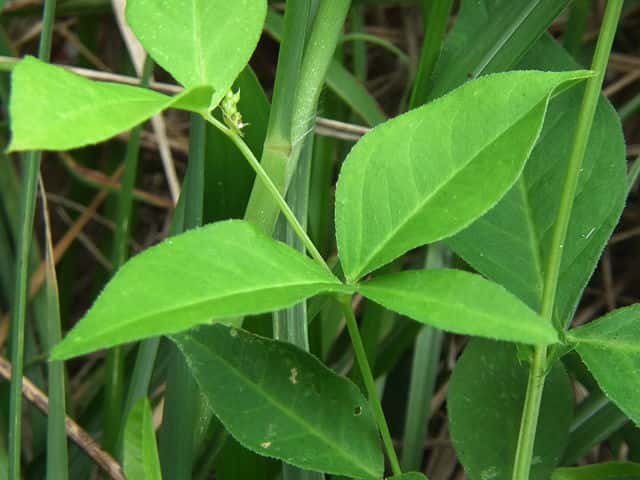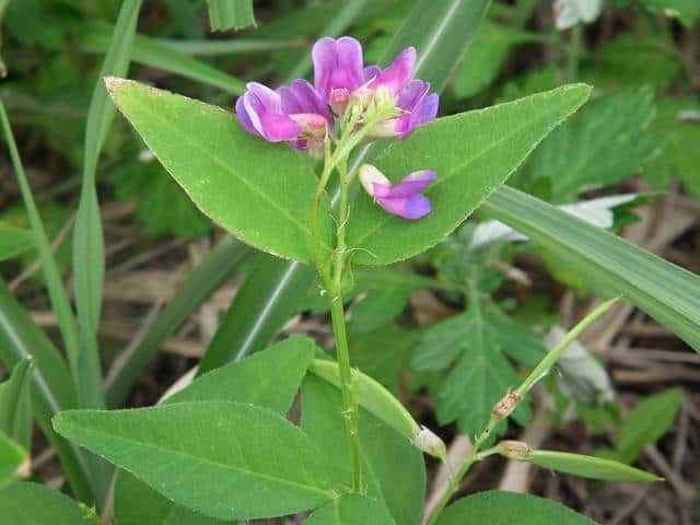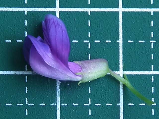 | ▼花は長さ約1.3cm。 | ▼(上)翼弁、旗弁、翼弁、(下)竜骨弁 | ▼葉は通常小葉2枚の複葉。 |
