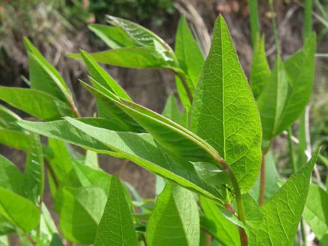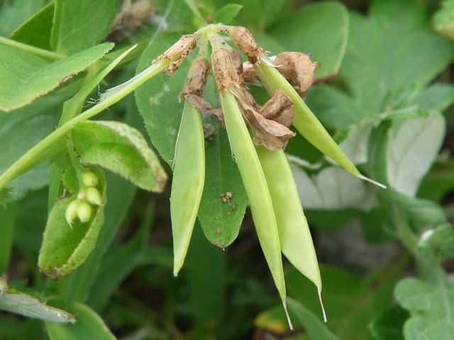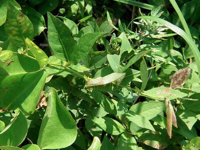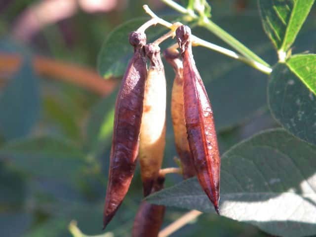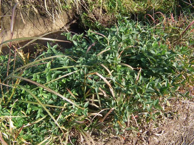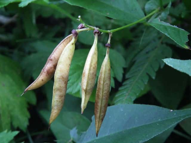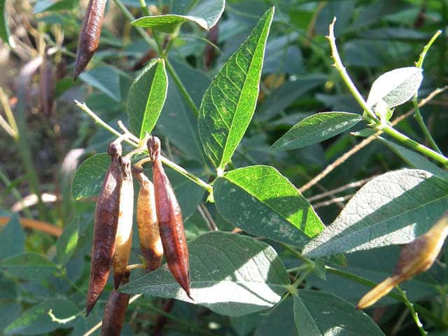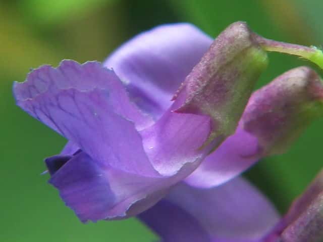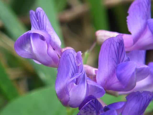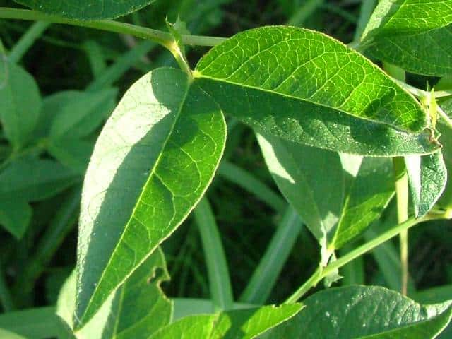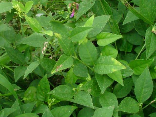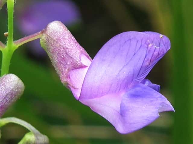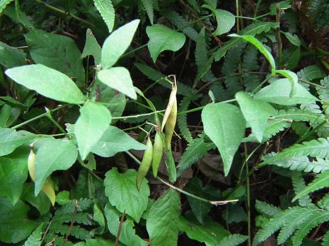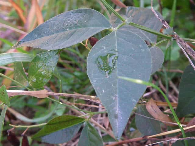 | ▼花は長さ約1.3cm。 | ▼(上)翼弁、旗弁、翼弁、(下)竜骨弁 | ▼葉は通常小葉2枚の複葉。 |