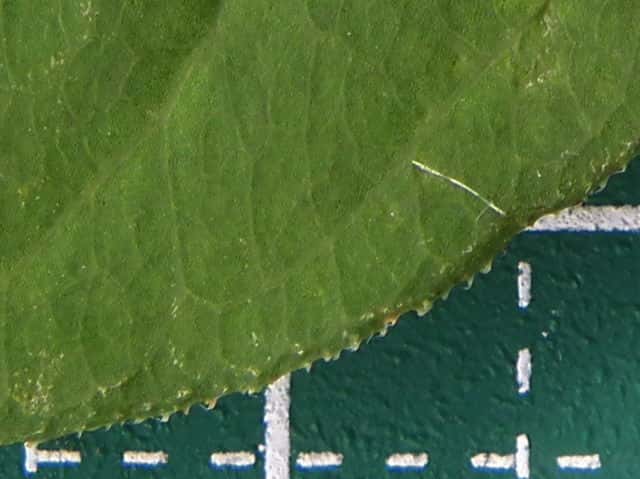 | ▼小葉は長さ約6.5cm。 | ▼葉の縁に刺状の突起がある。 | |