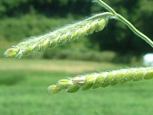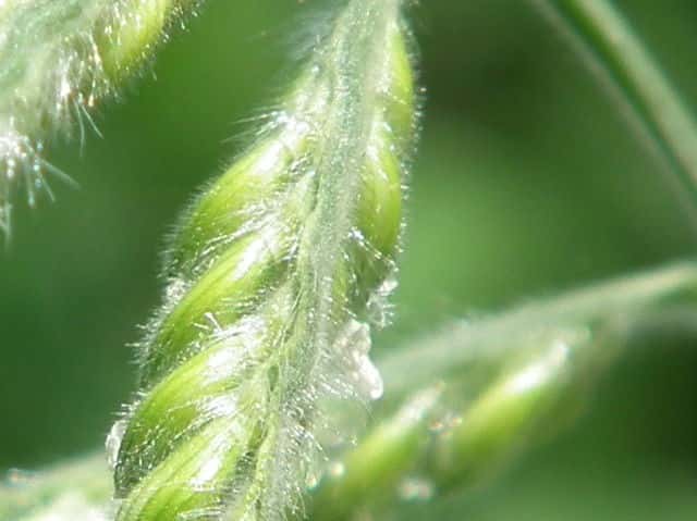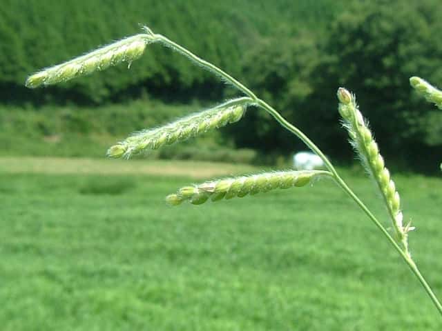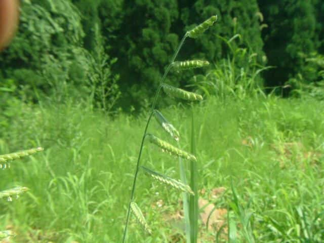 1年草 本州〜沖縄の川原や原野、耕地の周辺などに生育し、単性または群生する。茎は高さ40〜70cm、直立叢生する。葉は長さ5〜20cm、幅5〜10mm。花序は総状、中軸は長さ7〜10cm、偏側に4〜6個の枝を出し、中軸や枝に軟毛が密生する。小穂は2小花からなり、卵状楕円形、長さ4〜4.5mm、短毛があり、下部に白色の総苞毛がつく。第1包穎は退化し小穂の基部をとりまく環状の鞘となる。果実は広楕円形、腹面は扁平、灰黄色、長さ2.5〜3mm。花期は7〜8月。(日本イネ科植物図譜) 学名は、Eriochloa villosa イネ科ナルコビエ属 |