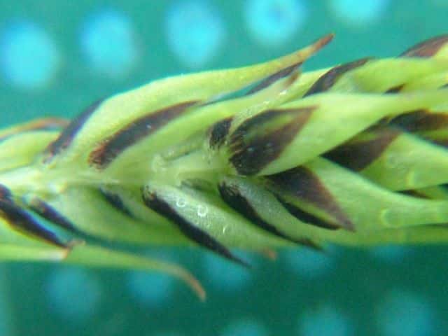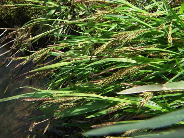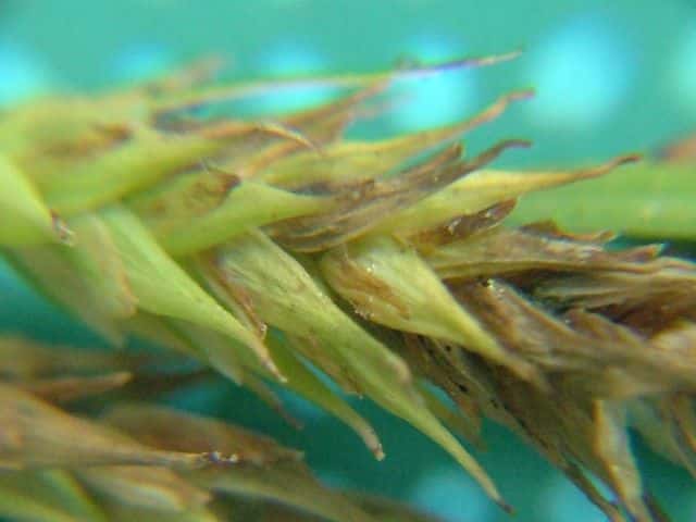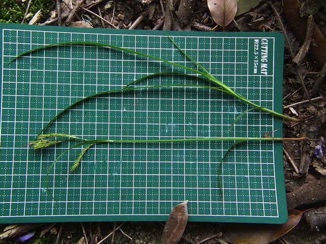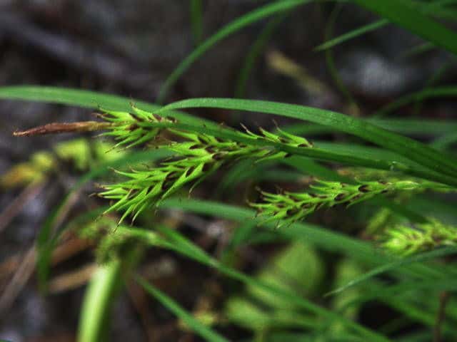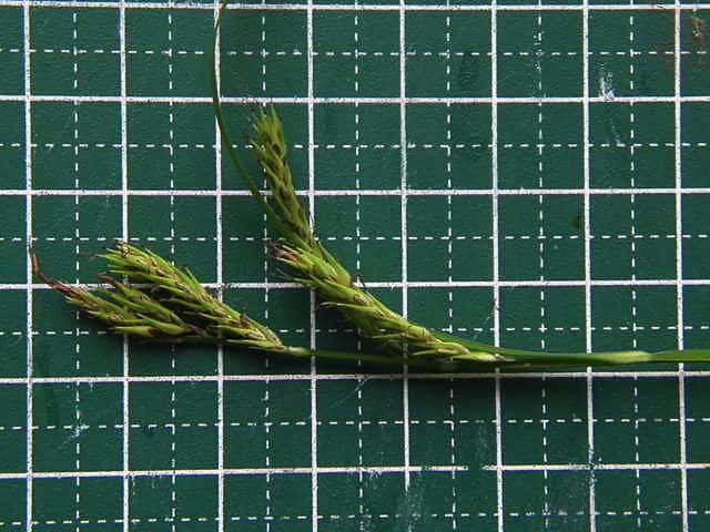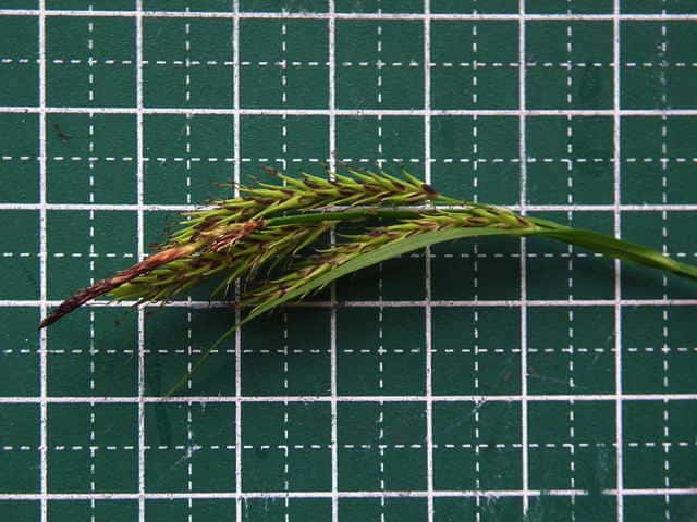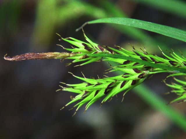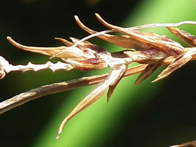 | ▼頂小穂は雄性、側小穂は雌性。 | ▼雌小穂は長さ約2cm。 | ▼果胞は細く、長い嘴がある。 |