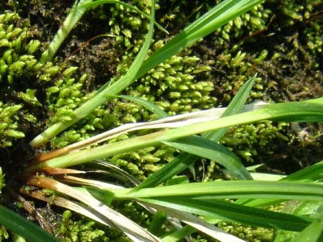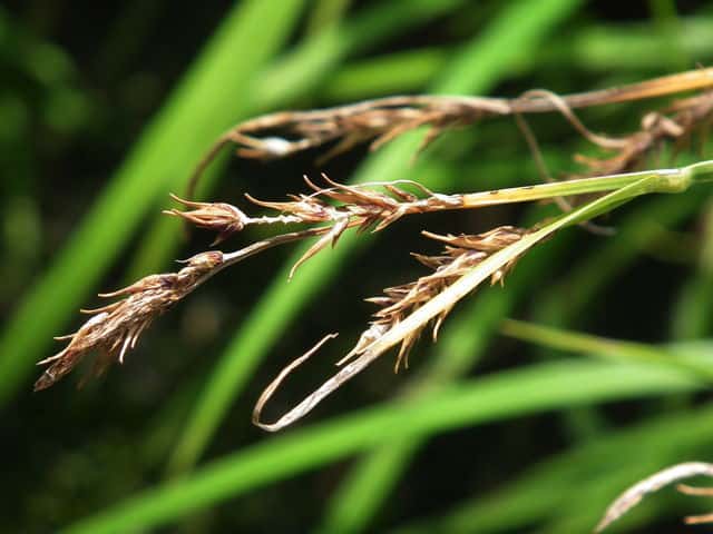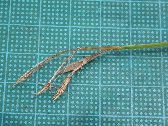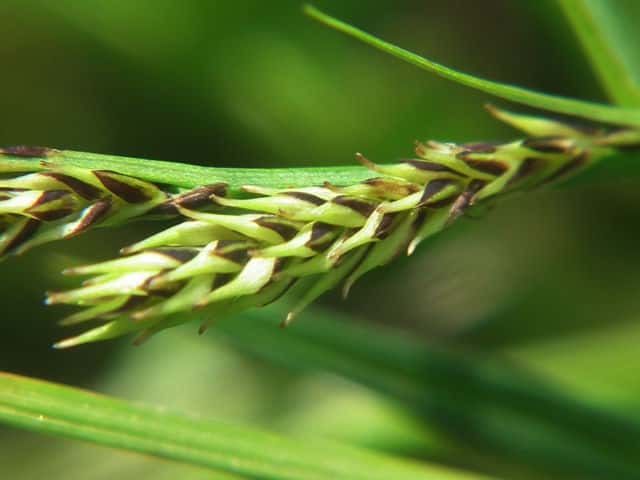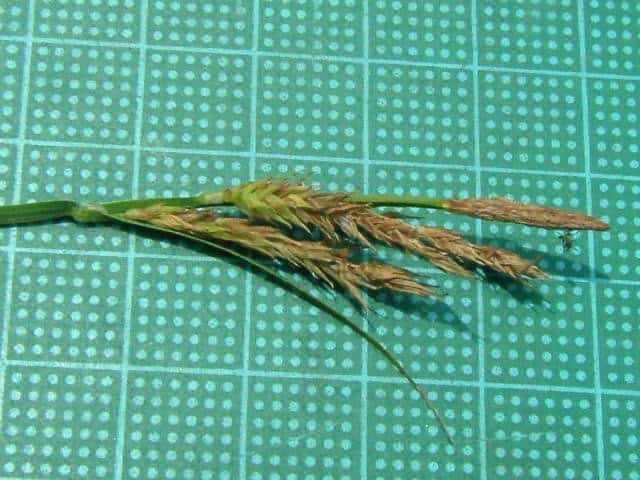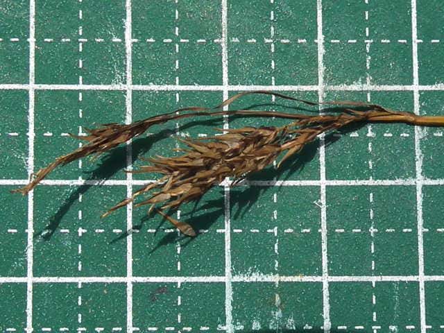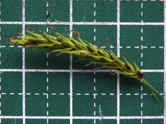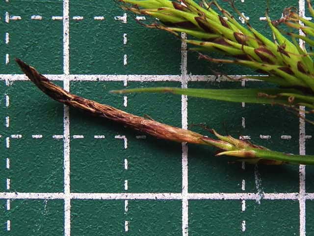 | ▼雄小穂は長さ約2cm。 | ▼雌小穂は長さ約3cm。 | ▼雌鱗片は紫褐色、果胞の半長以下。 |