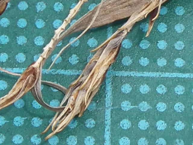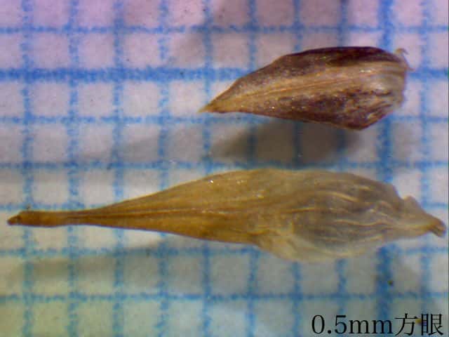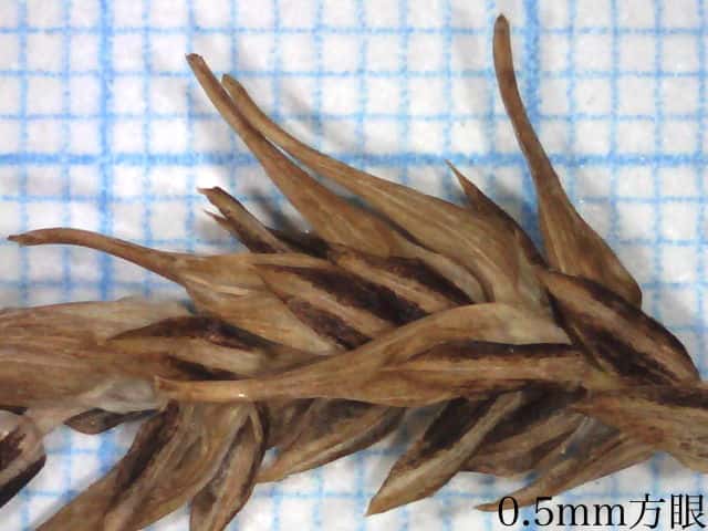 | v鱗片は紫褐色を帯び、果胞より短い。 | ▼鱗片は長さ約2.5mm、果胞は5mm。 | v果実は果胞にゆるく包まれる。 |